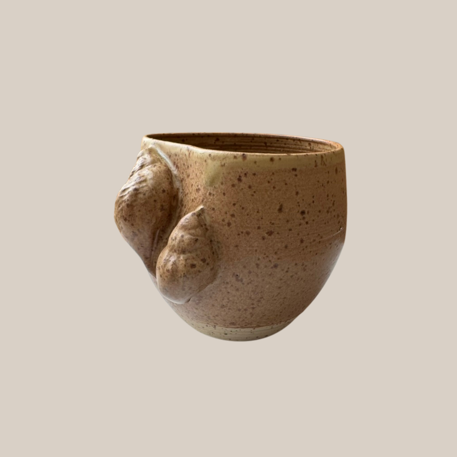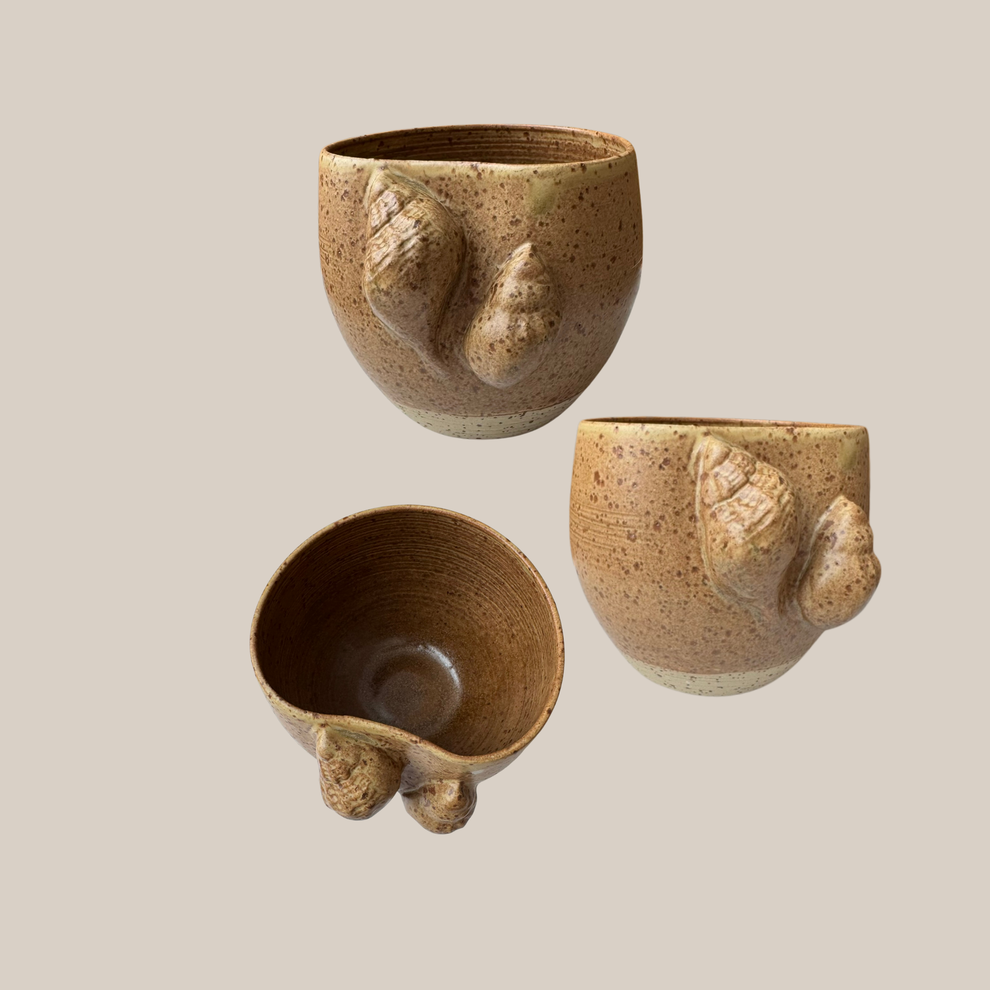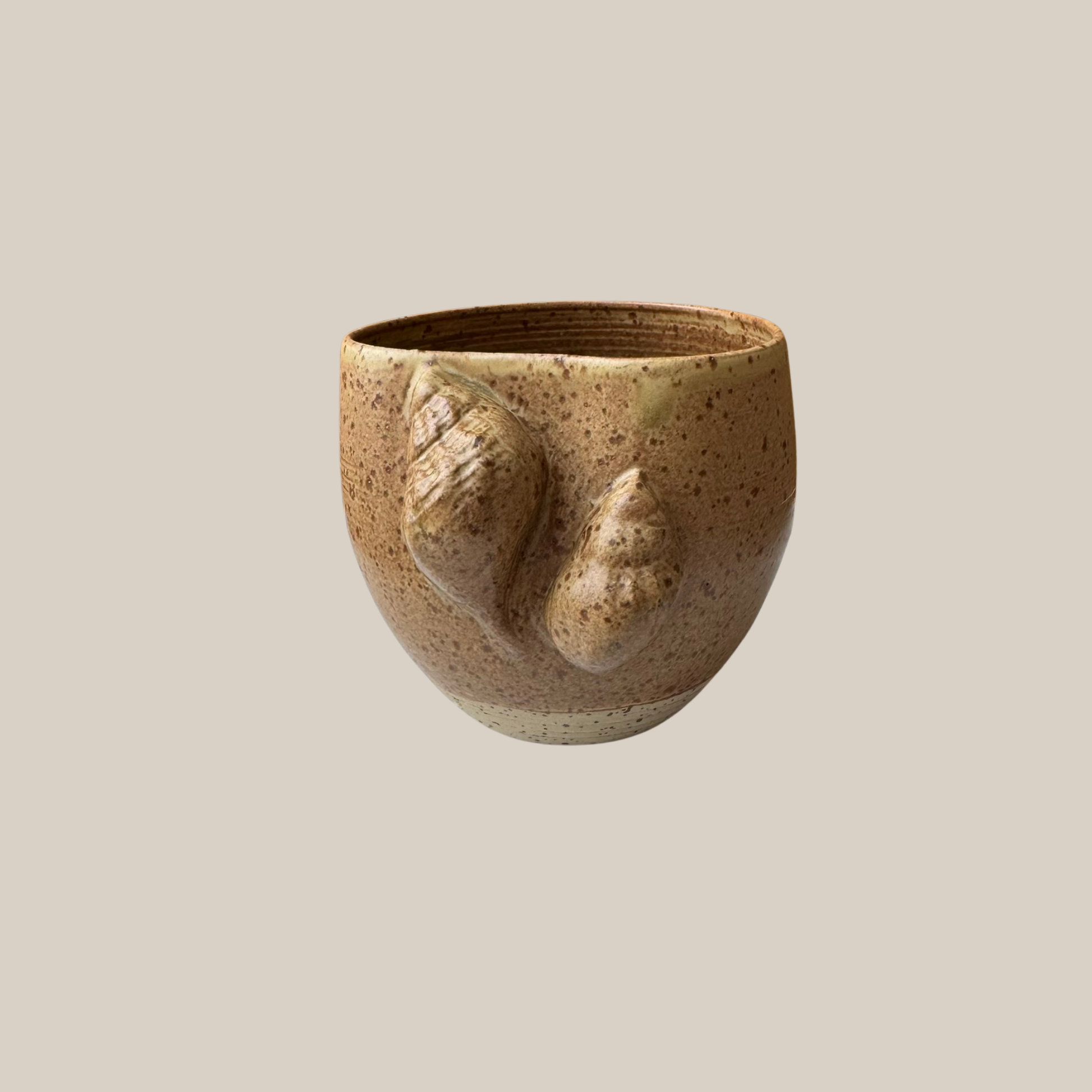 Keramik kop med to konkylier. Drejet i lys stentøjs ler med prikker og glaseret i smuk gylden glasur.