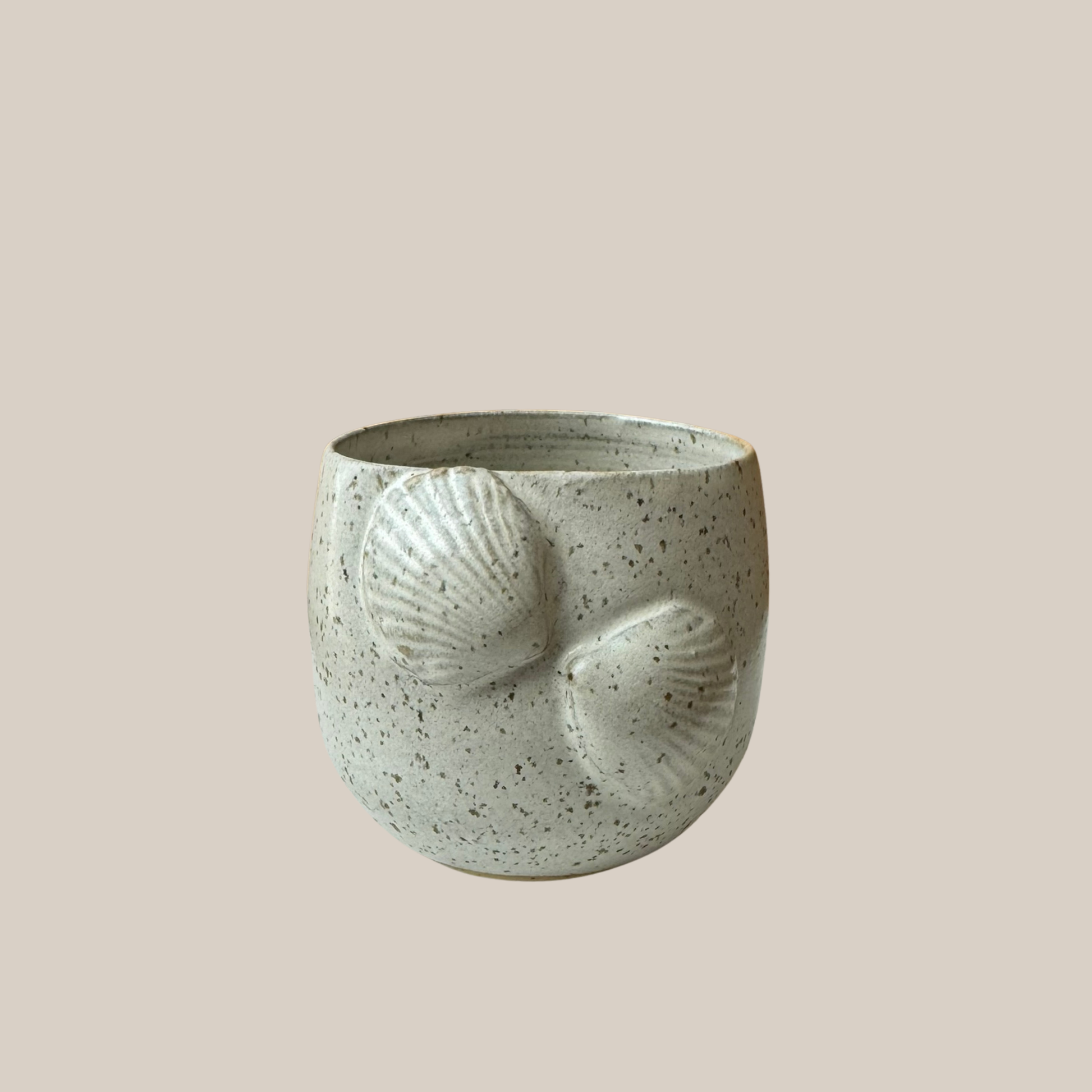 Keramik kop med muslingeskaller. Drejet i lys stentøjs ler med prikker og glaseret i smuk beige glasur.