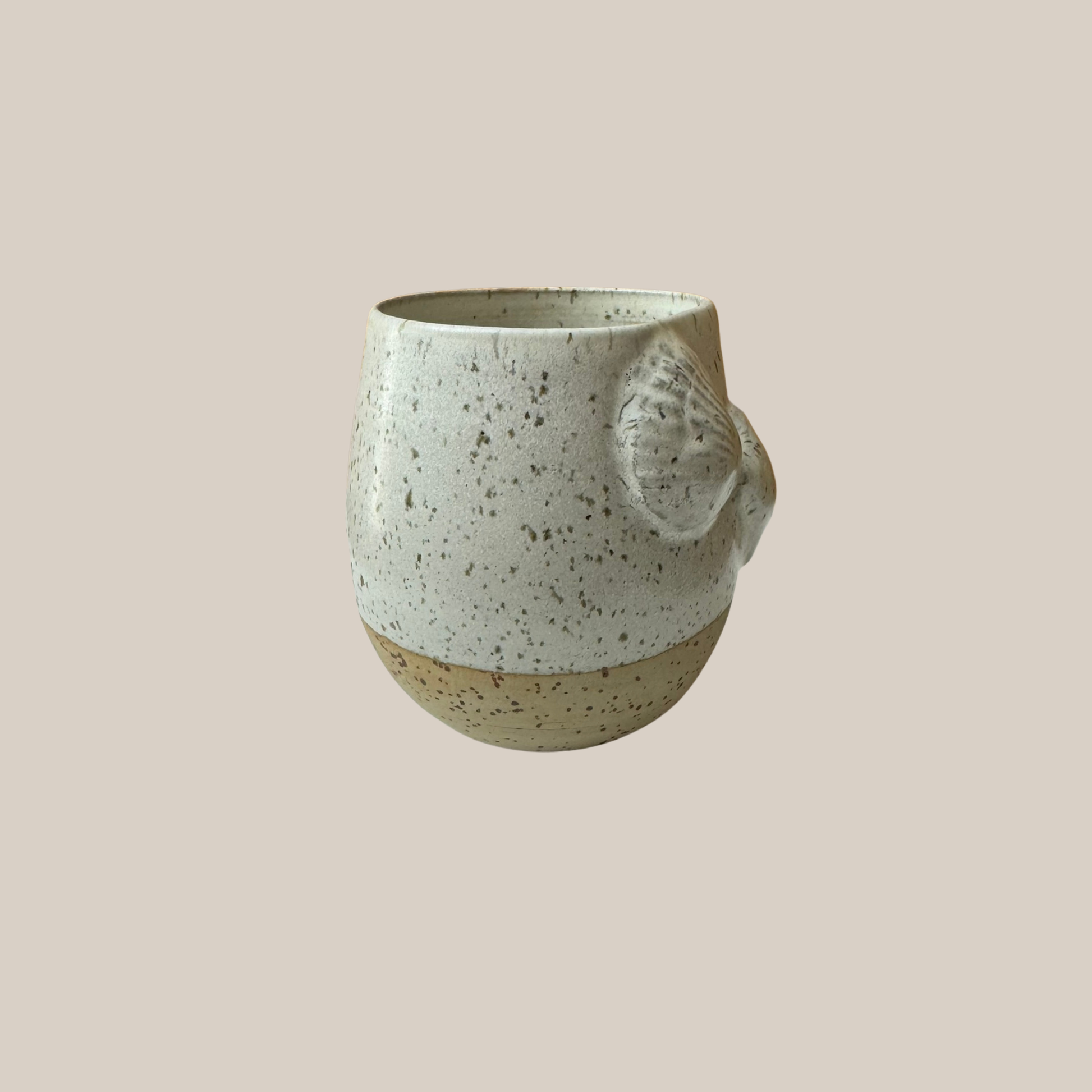 Keramik kop med muslingeskaller. Drejet i lys stentøjs ler med prikker og glaseret i smuk beige glasur.