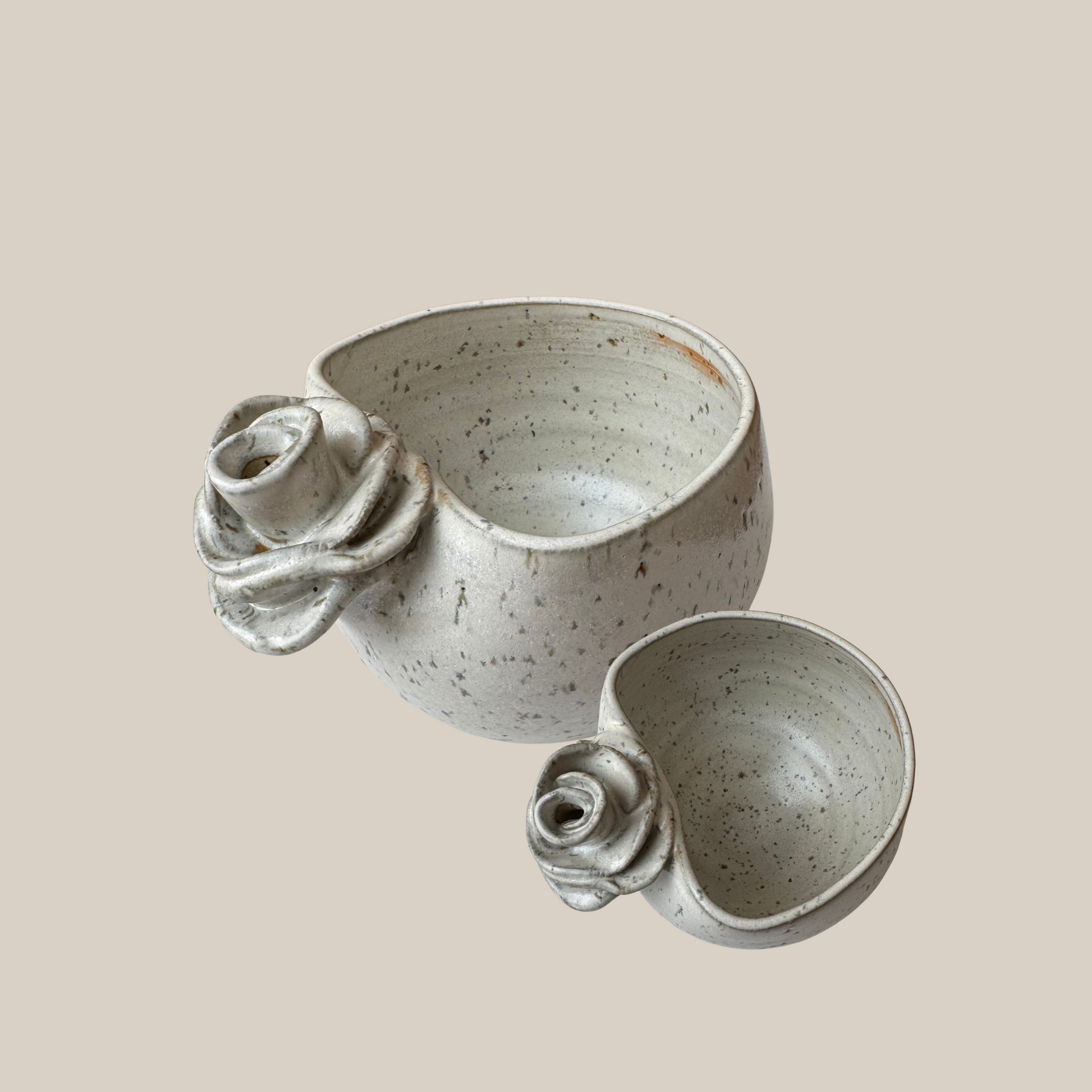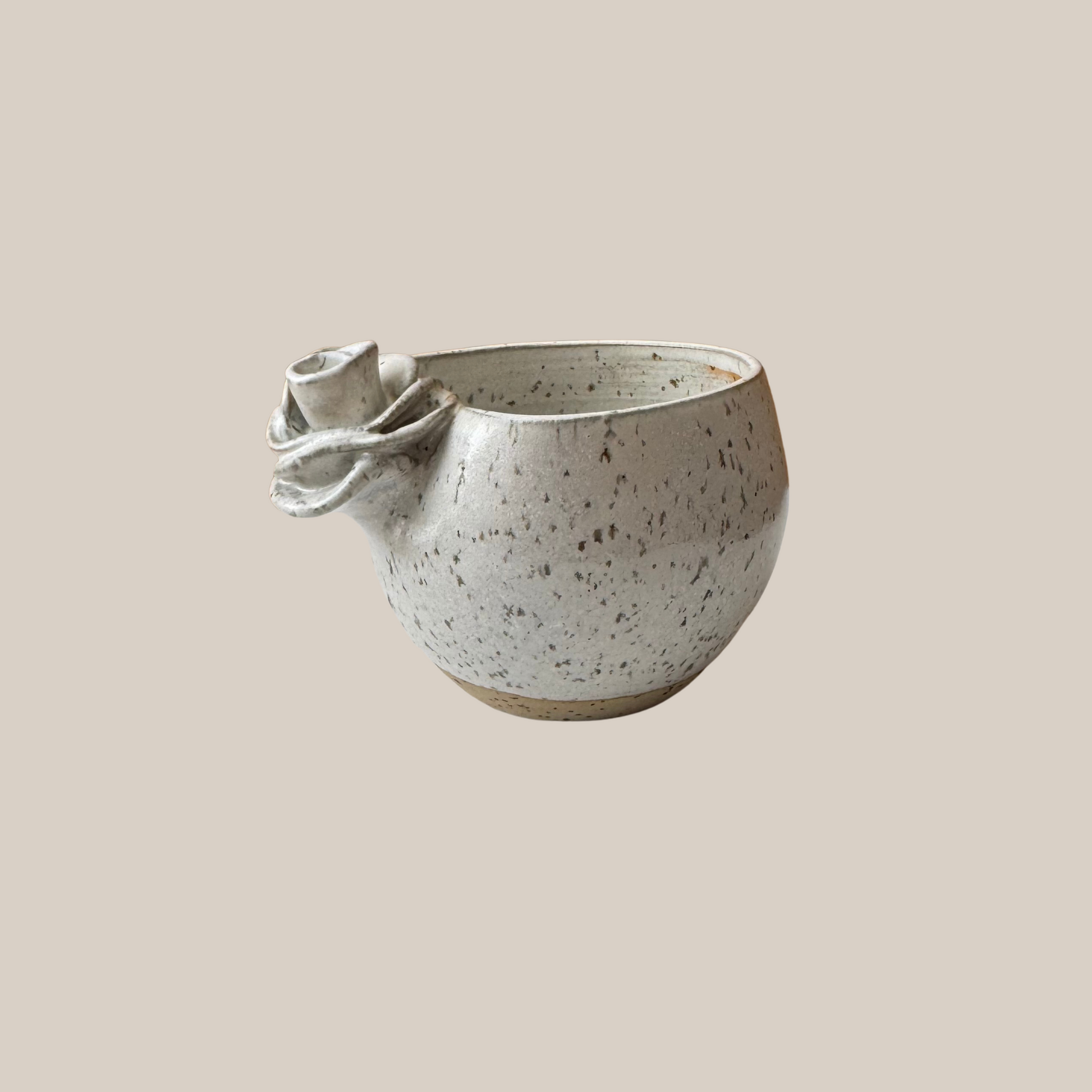 Denne kop er mindre end de alm. signaturkopper. Den vil egne sig fint til en dobbelt espresso ( ca. 1,5 dl ) Koppen er drejet i en lys stentøjs ler med prikker og dekoreret med en enkelt rose. Glasuren er beige.