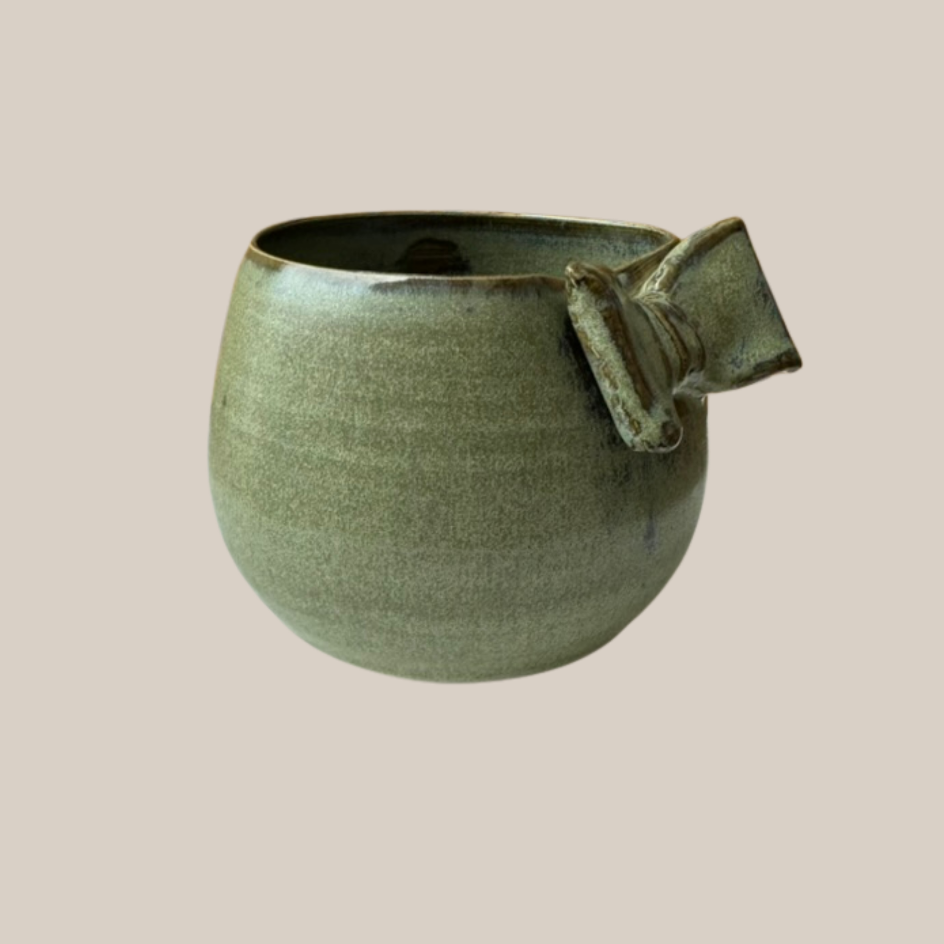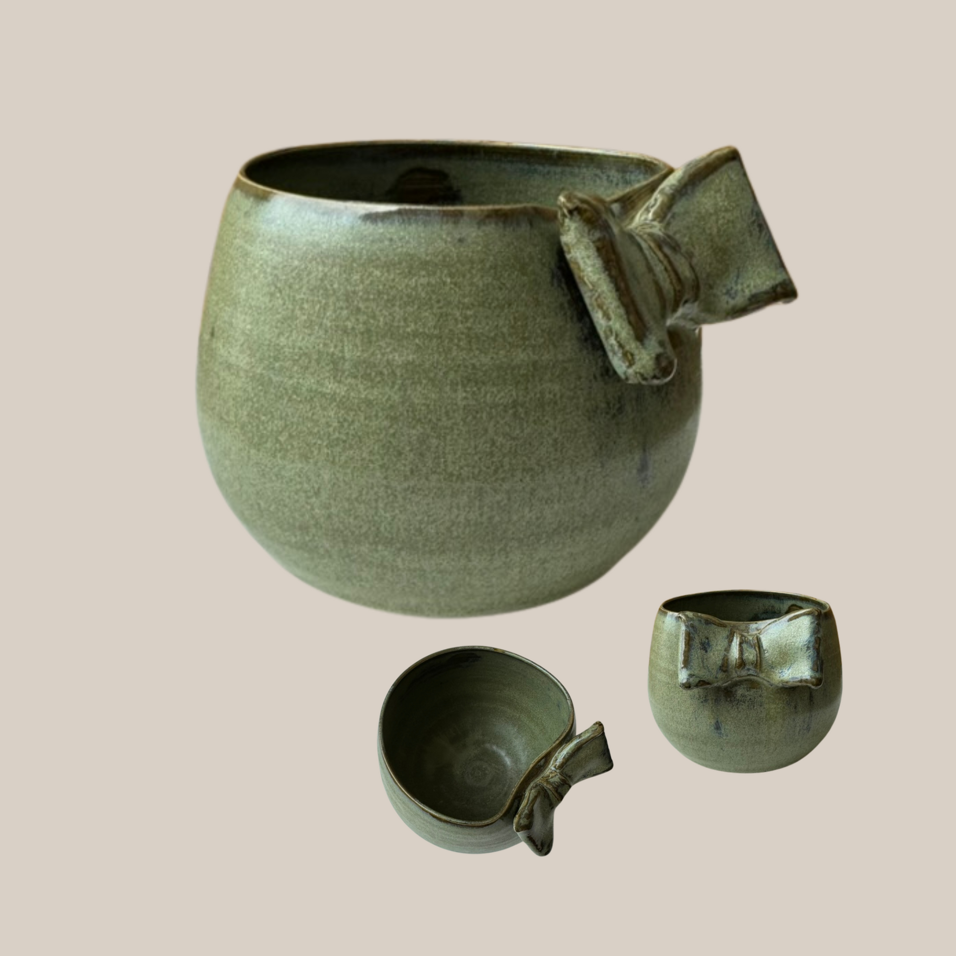 Keramik kop med sløjfe. Drejet i lys stentøjs ler og glaseret i smuk grøn glasur.