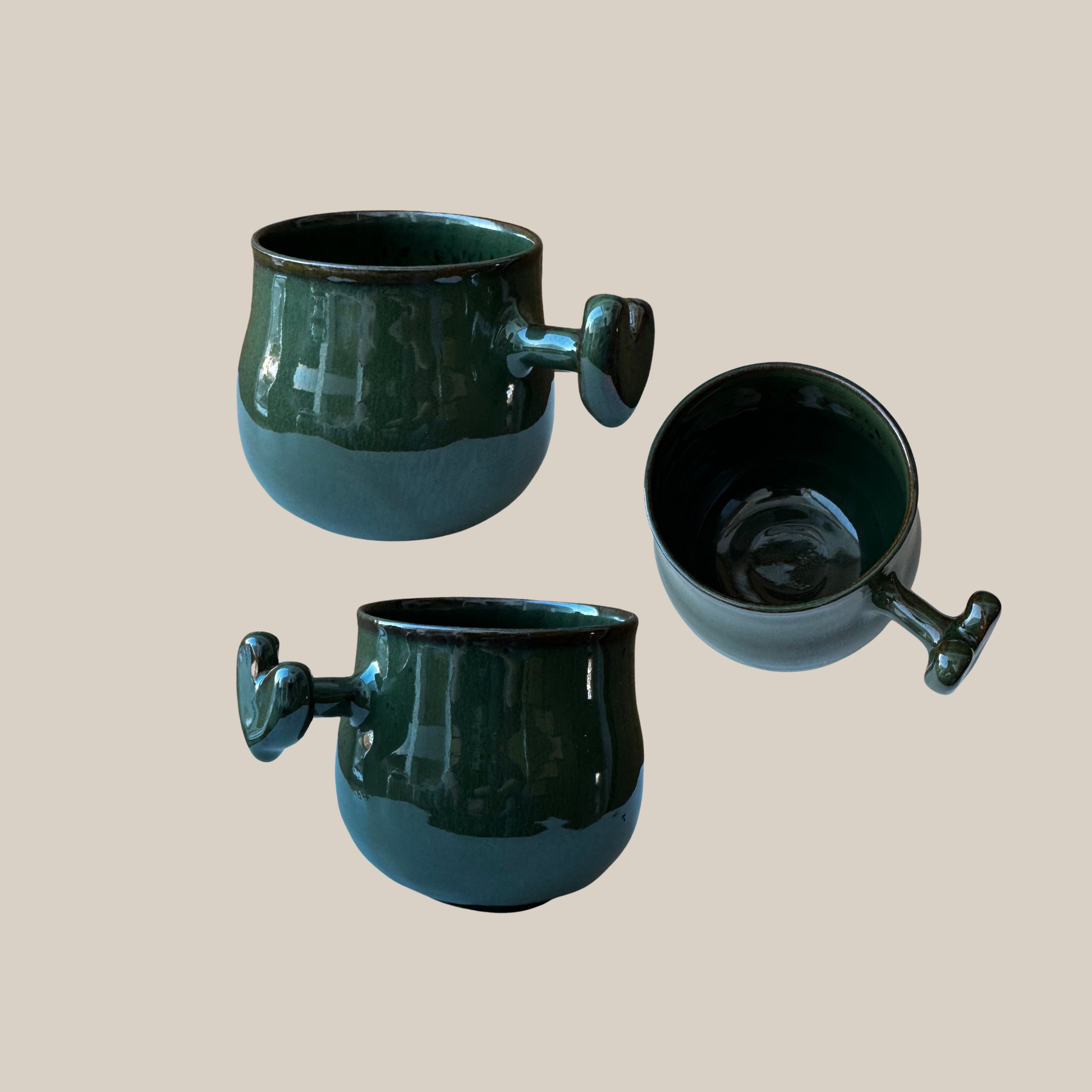 Denne kop kan indeholde ca. 250 ml. Koppen er drejet i lyst stentøjs ler og glaseret med en flot mørkegrøn glasur.