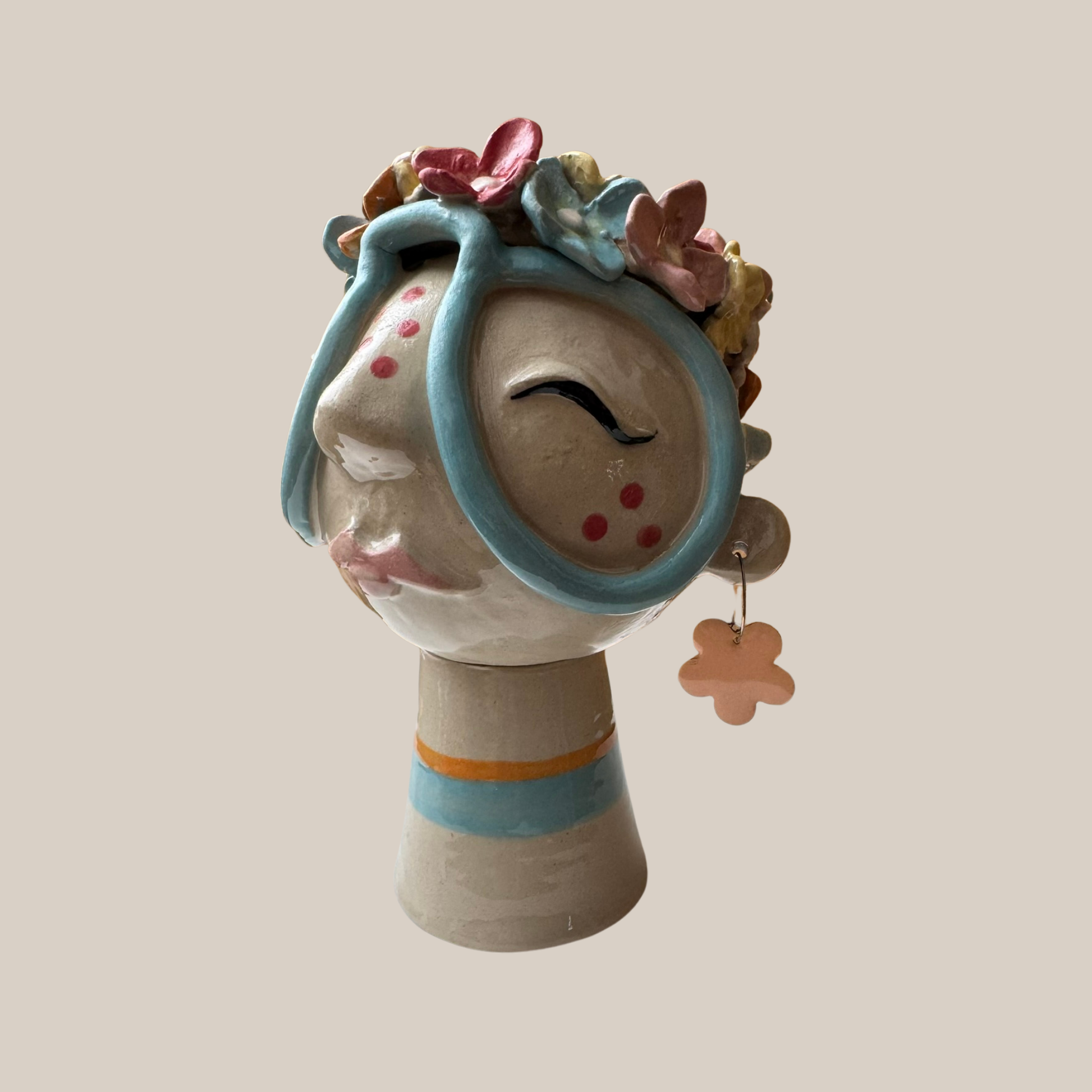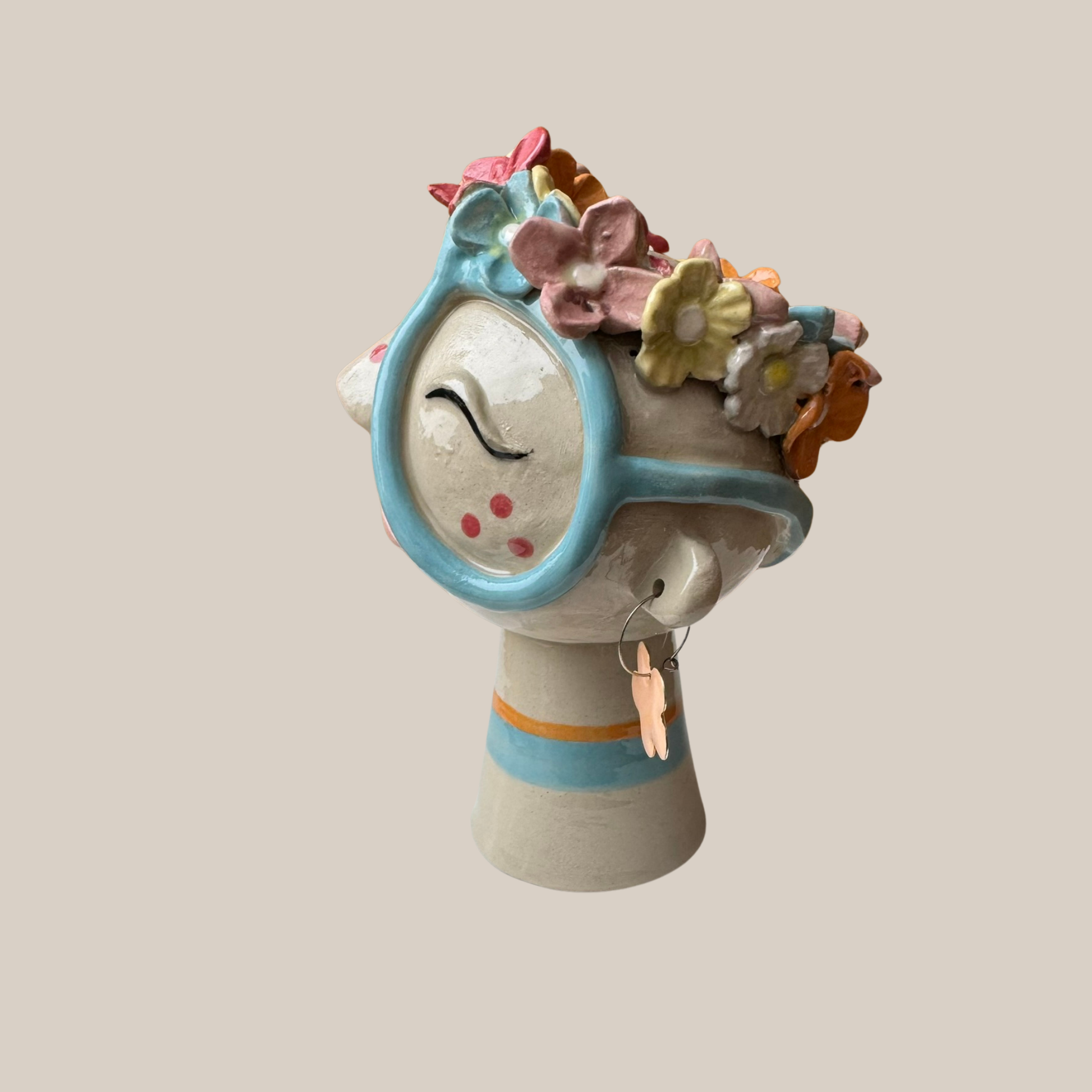 Denne Kiki Kalypso er ca. 20 cm høj, og selve hovedet har en diameter på ca. 12 cm uden pynt.
