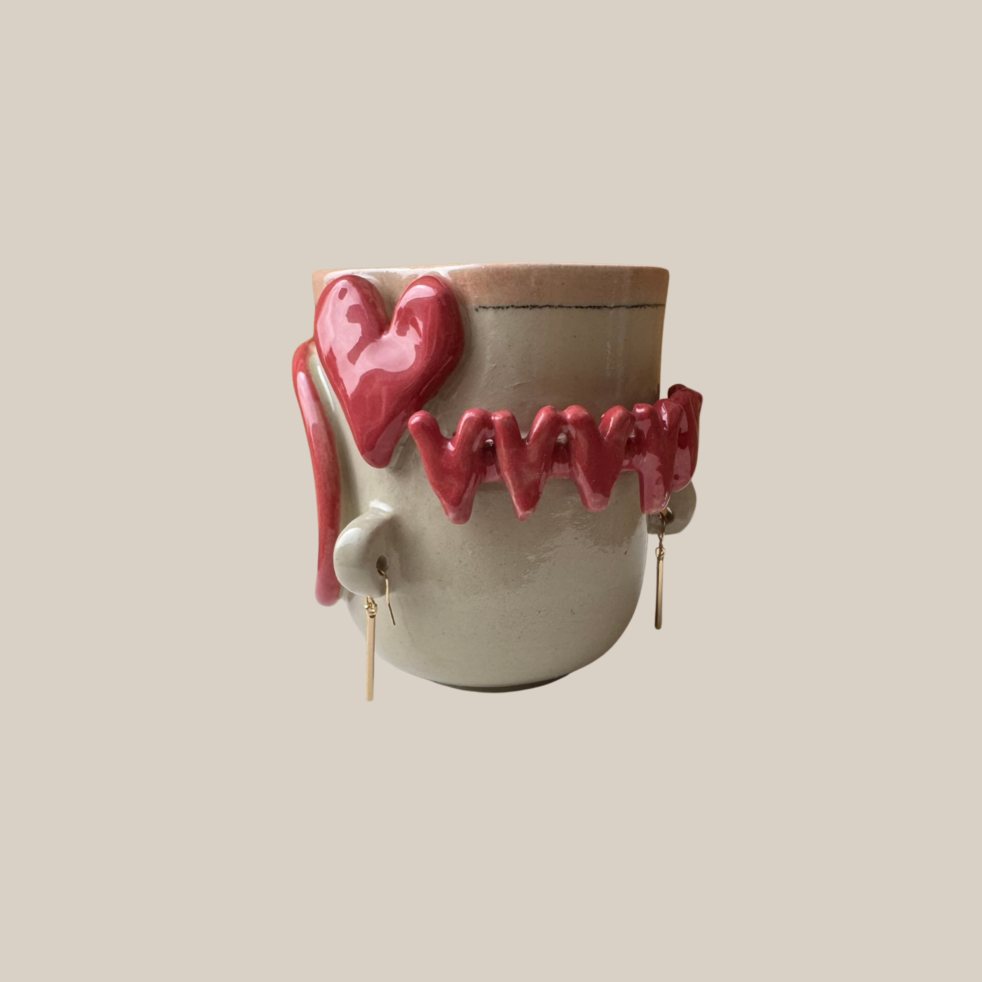 Denne Kiki kop har en dekoration af flere røde hjerter. Koppen er drejet i en lys stentøjs ler.