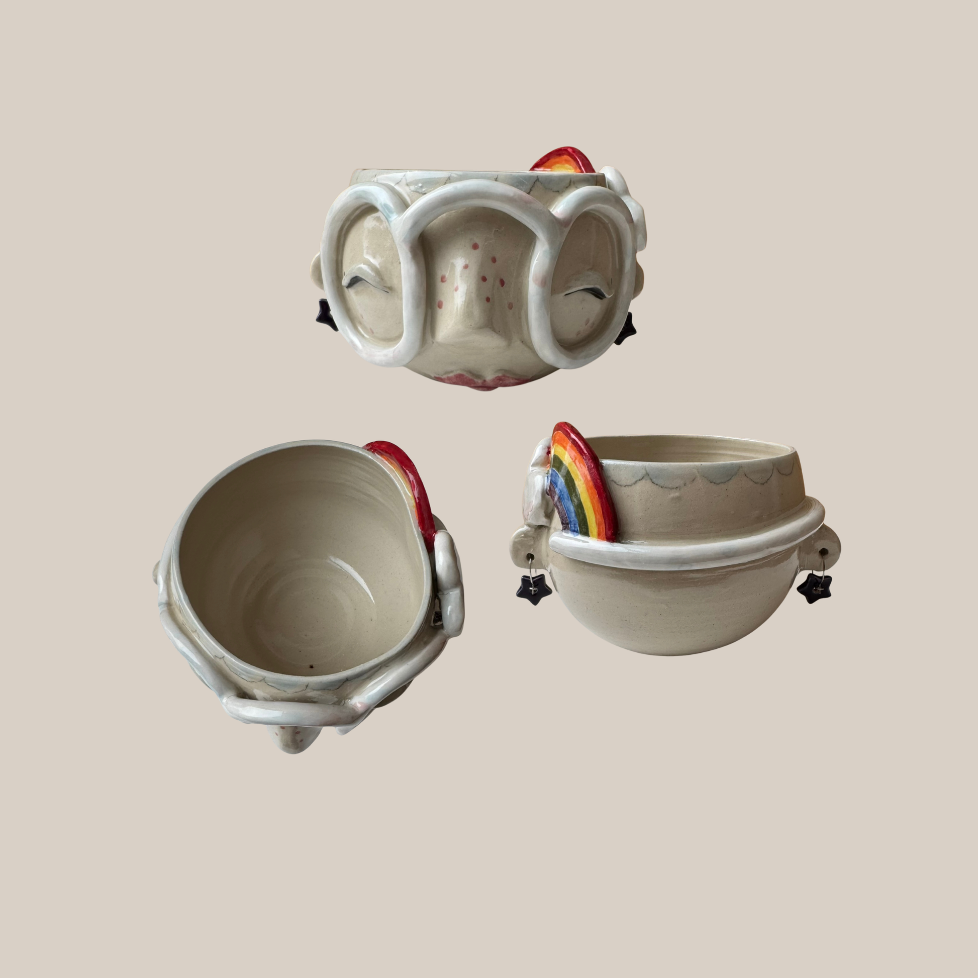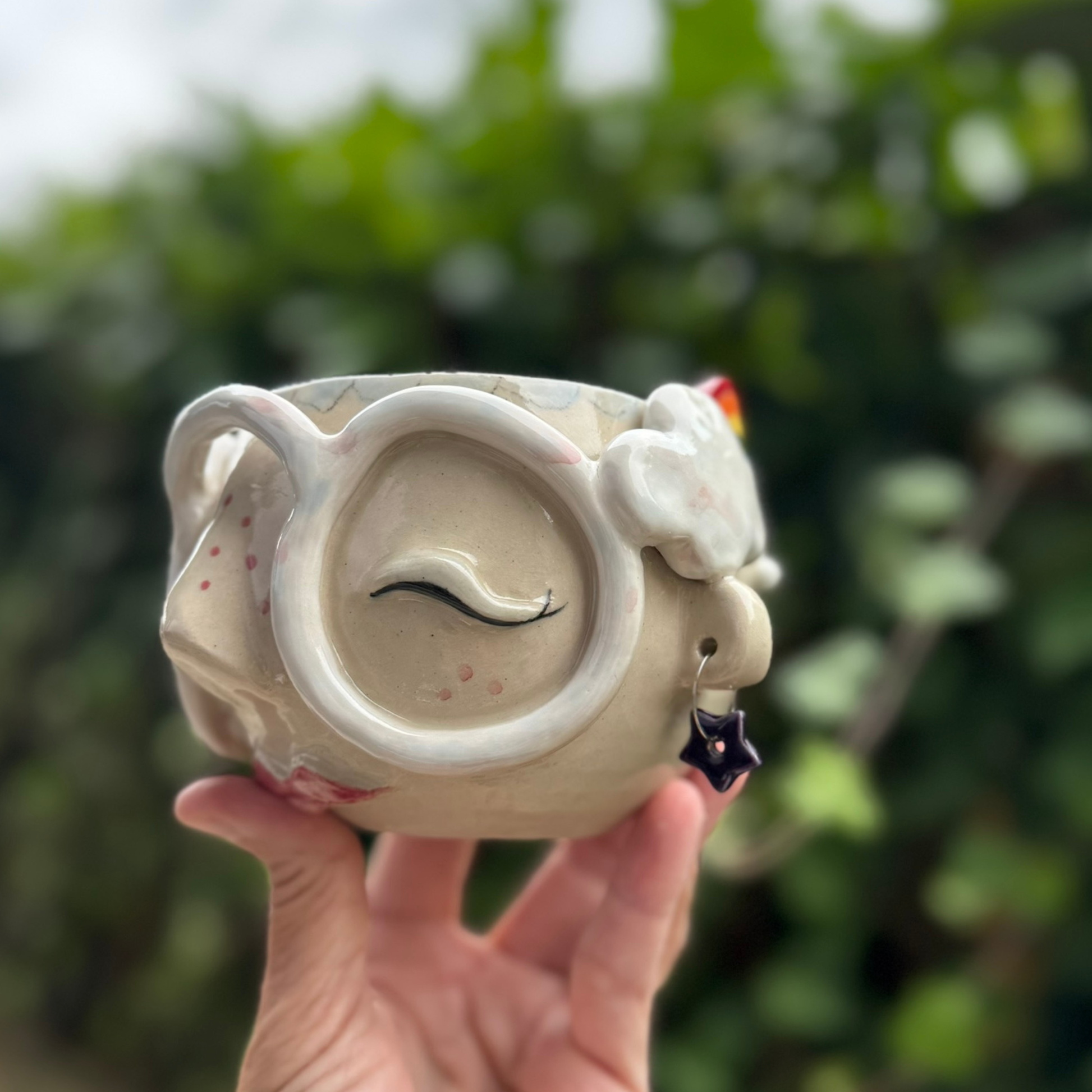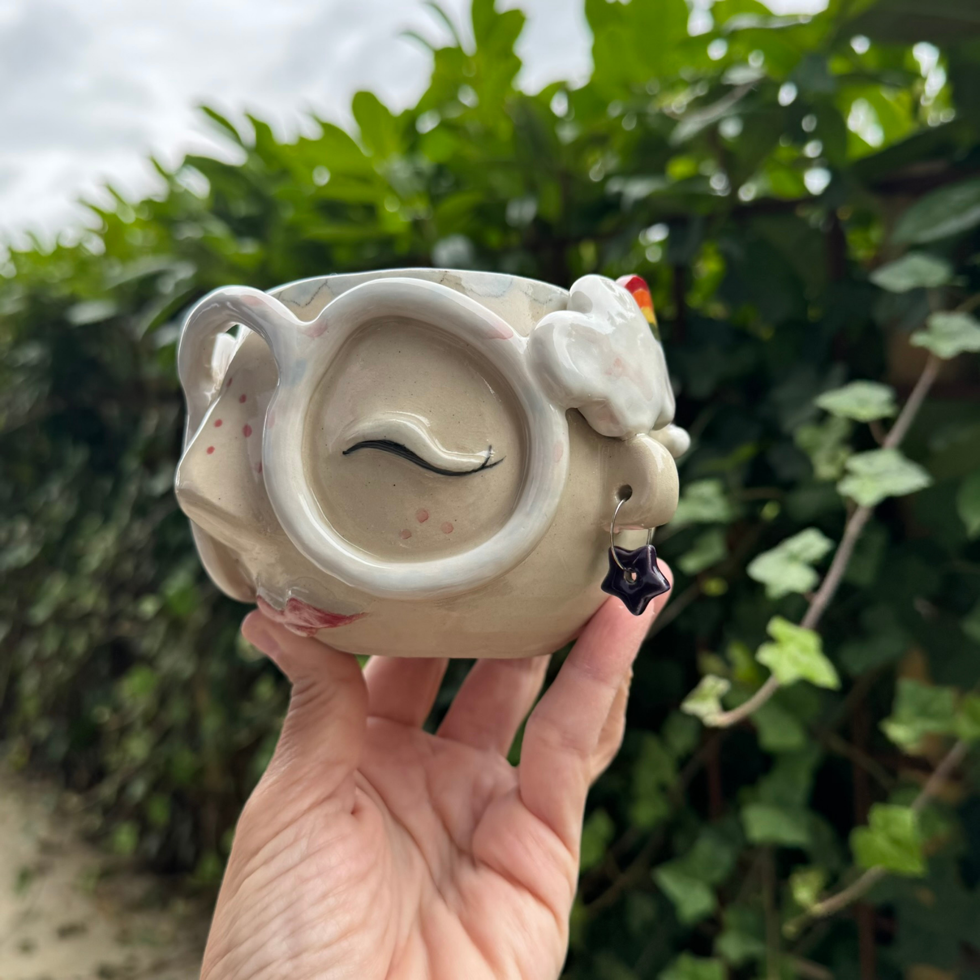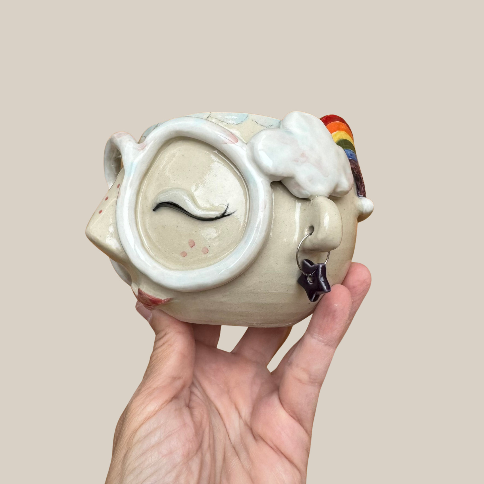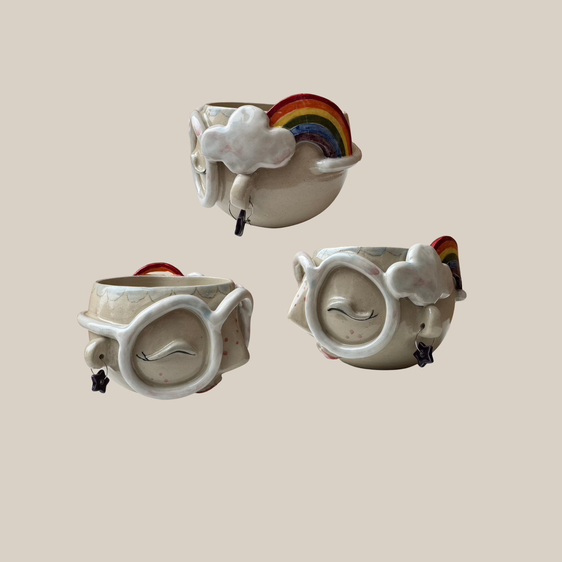 Denne Kiki kop har en dekoration af en sky og en regnbue. Koppen er drejet i en lys stentøjs ler.