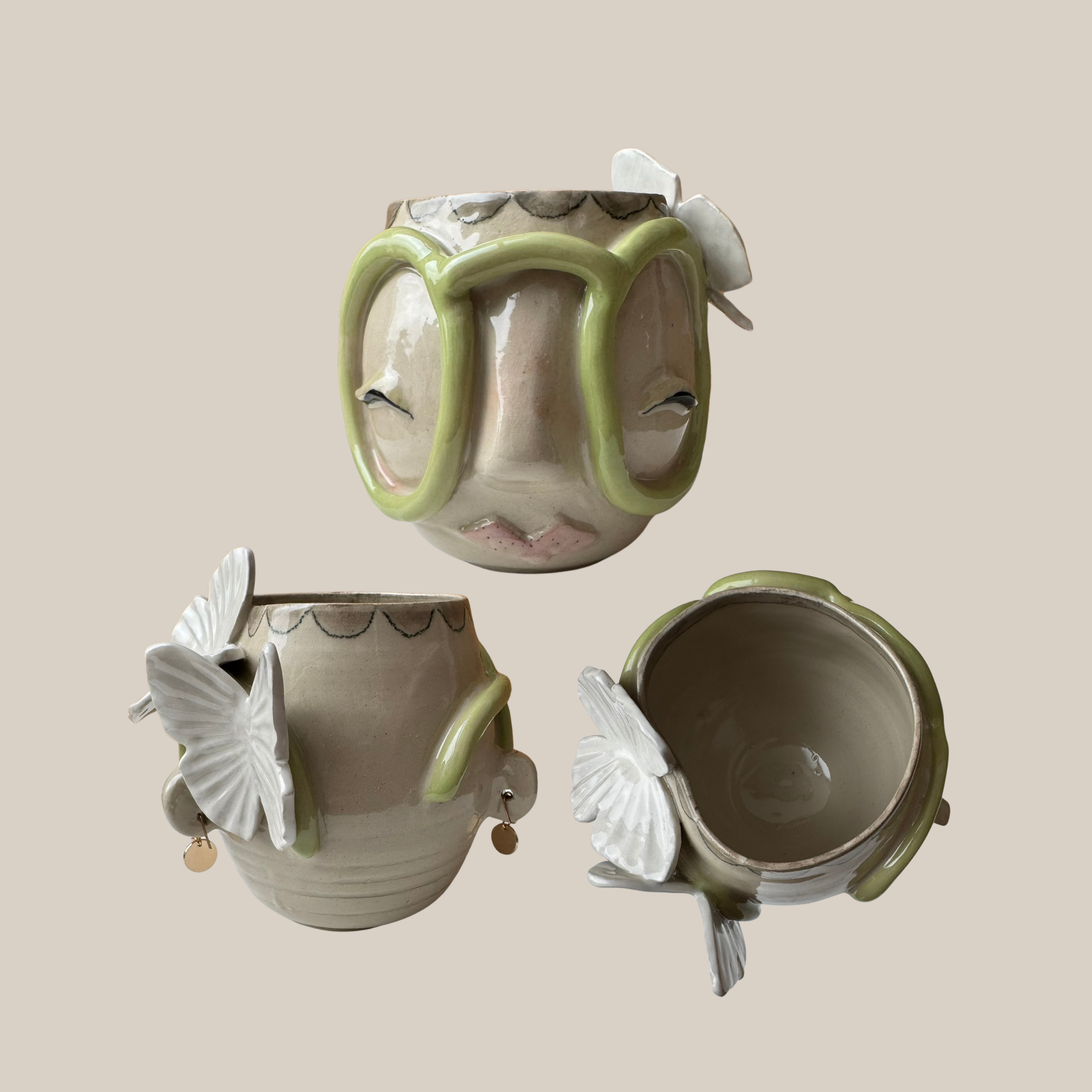 Denne Kiki kop har en dekoration af hvide sommerfugle. Koppen er drejet i en lys stentøjs ler.