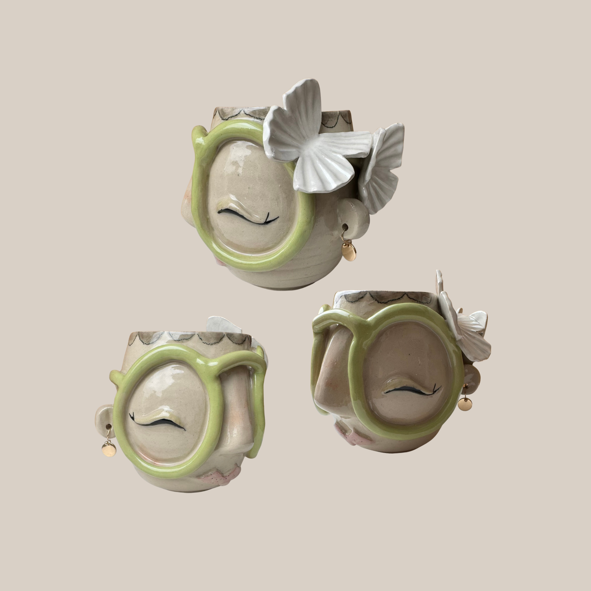 Nogle af kopperne har rigtige øreringe som pynter når de står i display, men de kan med lethed tages ud hvis du ønsker det. Desuden fungerer ørene rigtig godt som små hanke du kan holde på når du drikker.