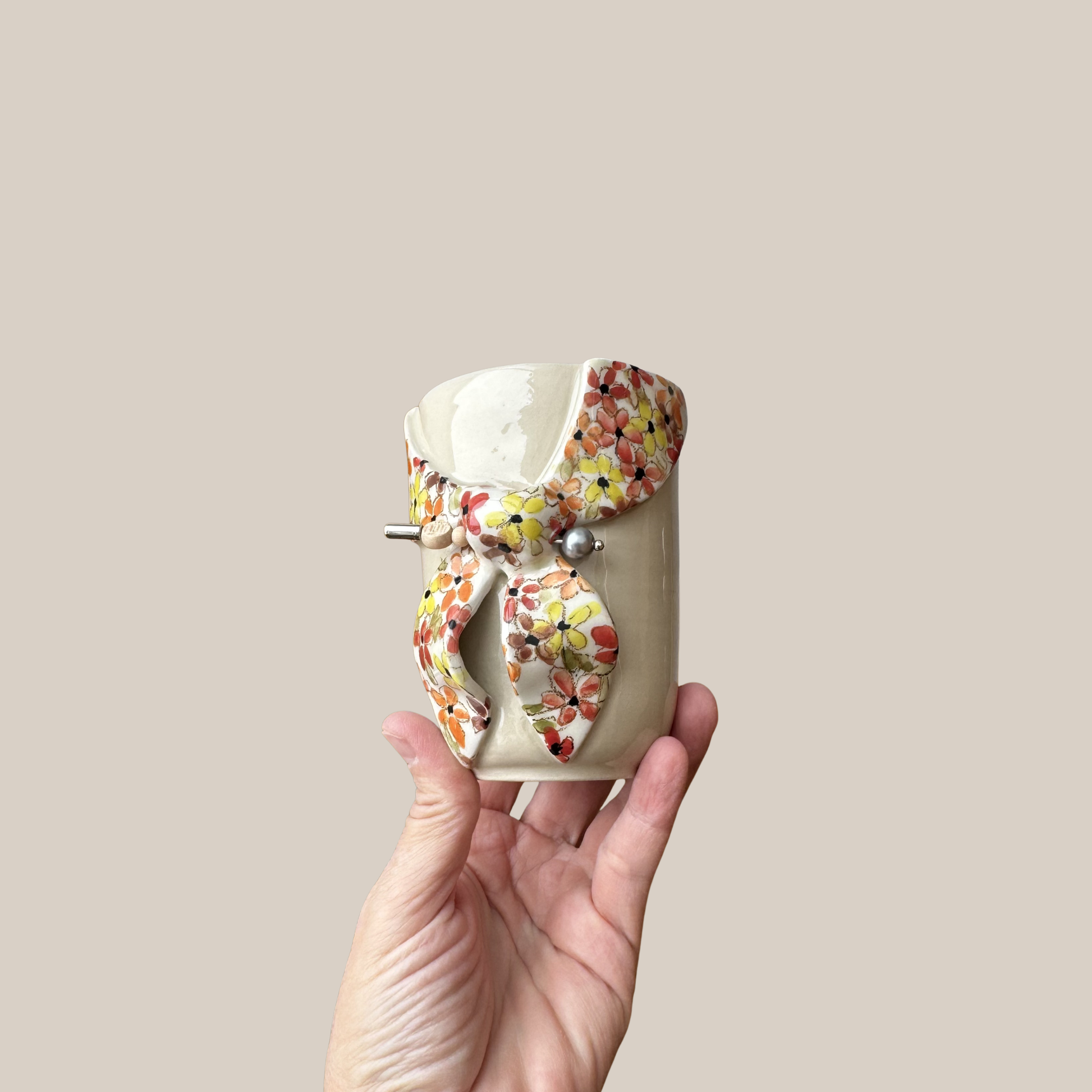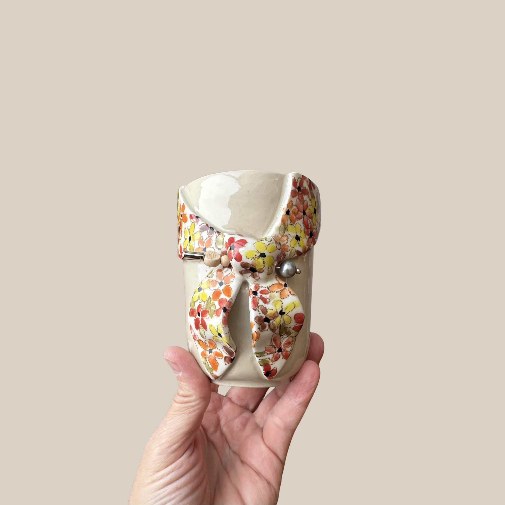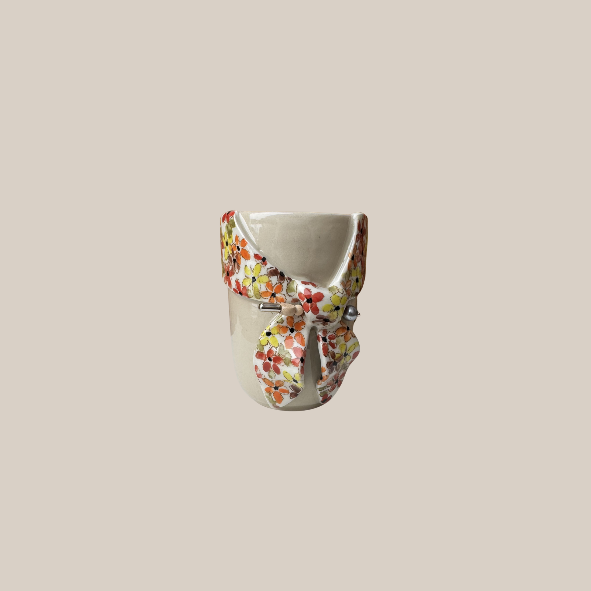 Koppen er drejet i en lys stentøjs ler og glaseret med fødevaregodkendte glasurer. Den kan komme i opvaskemaskinen. i så fald afmonter brochen imens:)