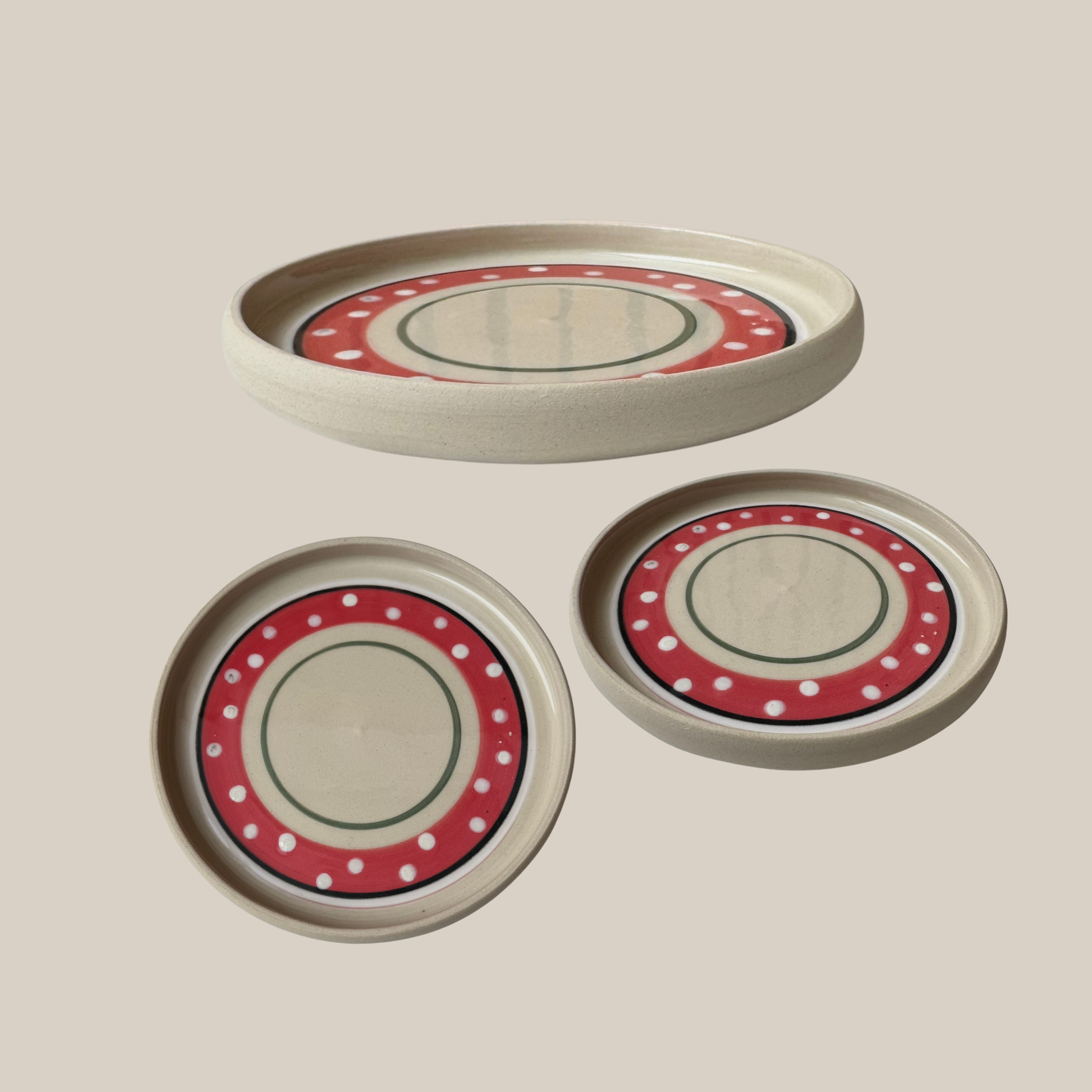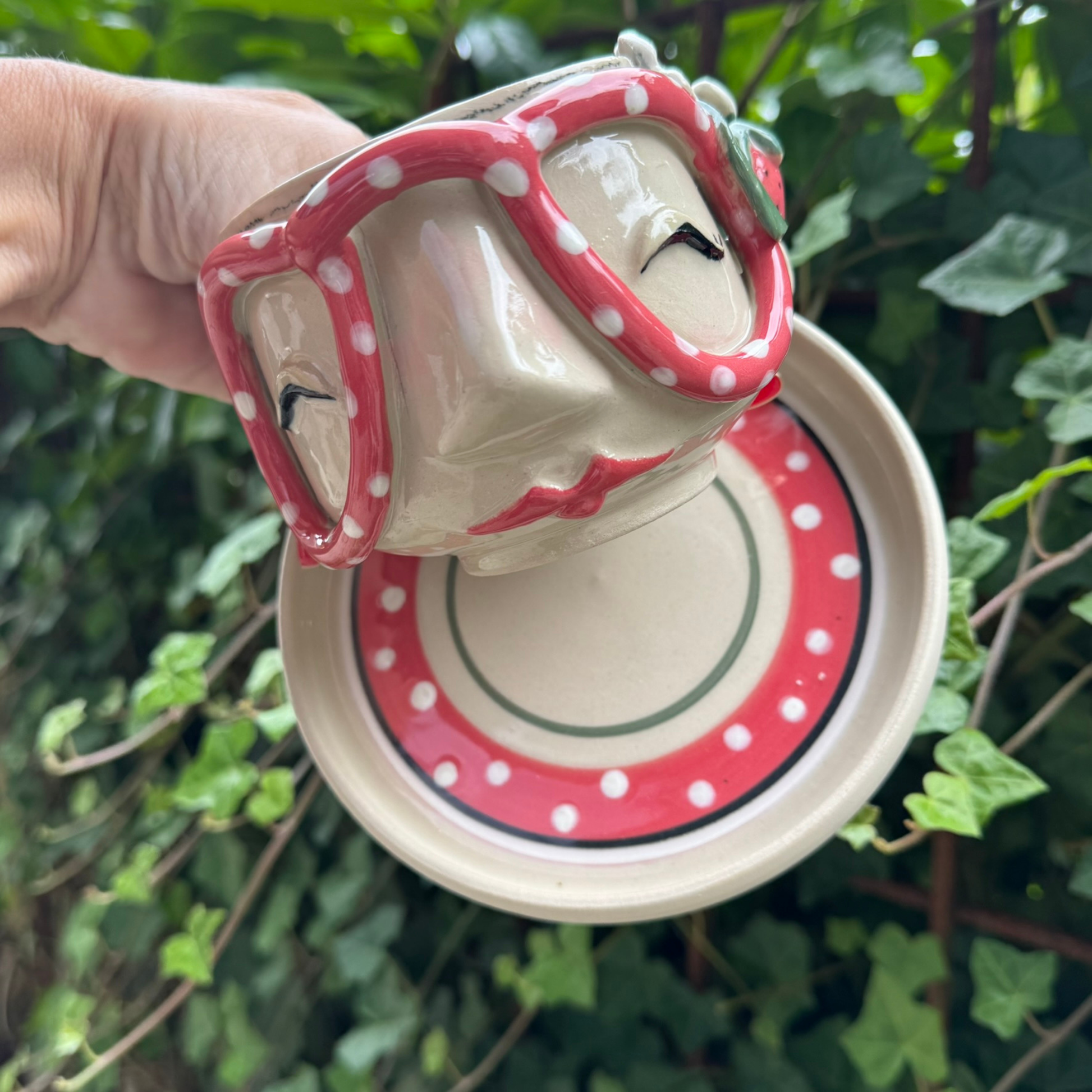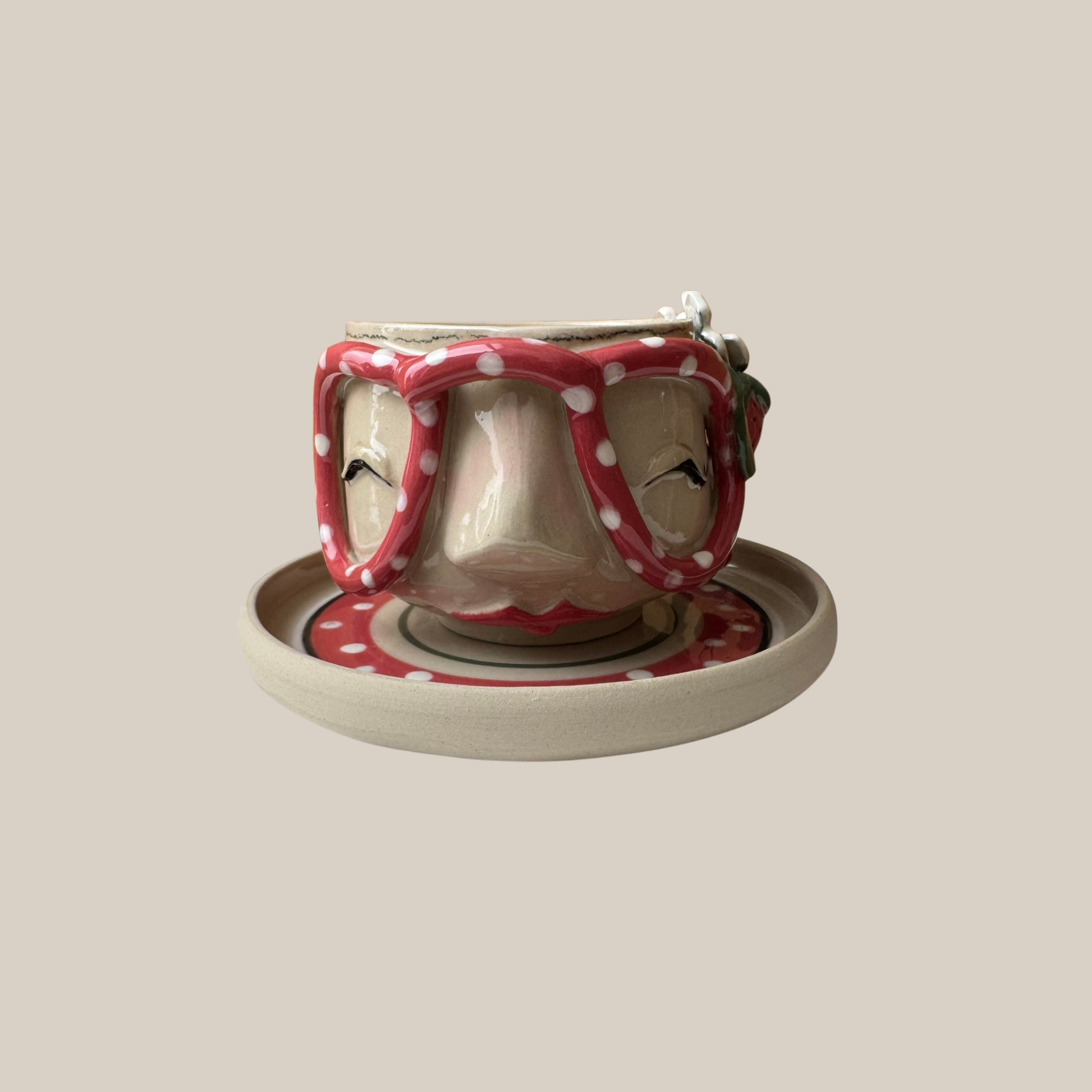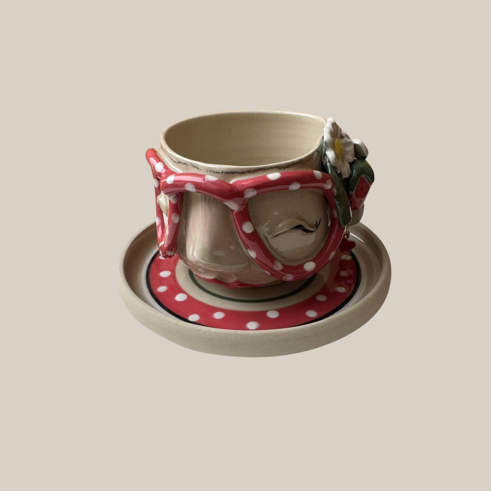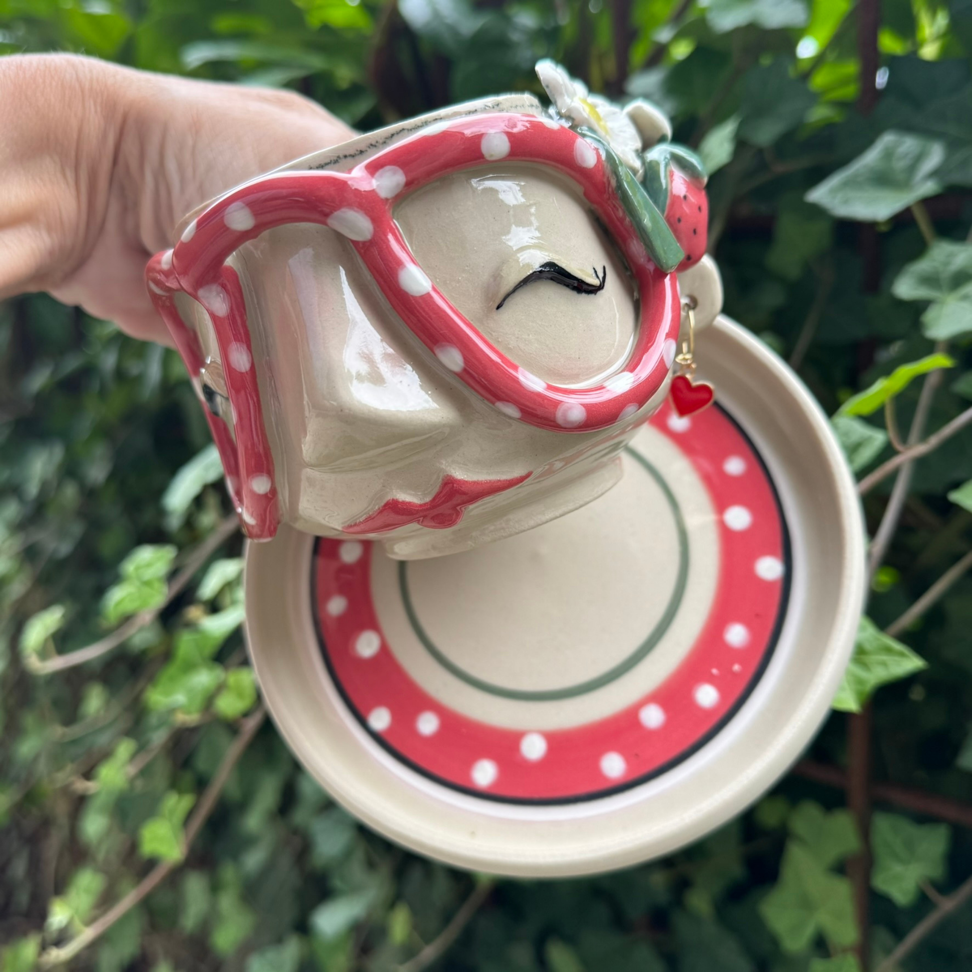 NYHED: Dette sælges som et sæt bestående af en Kiki kop og matchende tallerken. Farverne er rød, hvid og grøn, dekorationen forestiller jordbær med blomster og et bær. Sættet er drejet i en lys stentøjs ler.