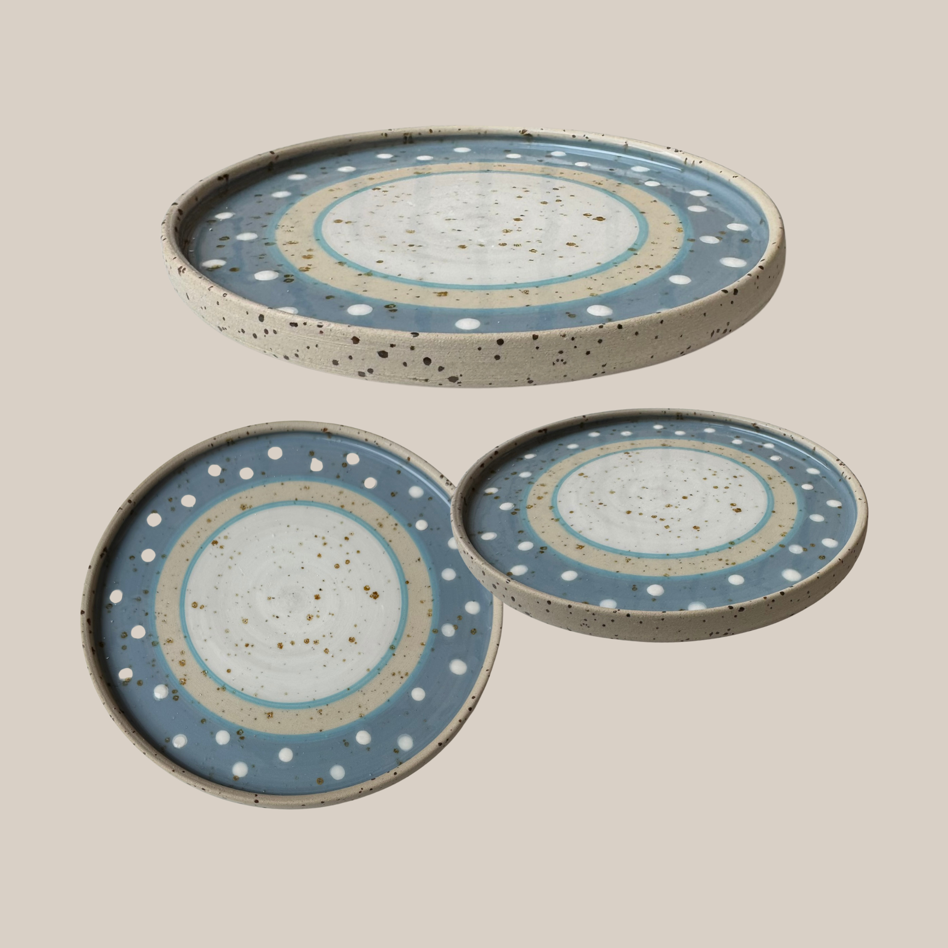 NYHED: Dette sælges som et sæt bestående af en Kiki kop og matchende tallerken. Farverne er blå/grå, og sættet er drejet i en lys stentøjs ler med lavaprikker. Dekorationen er konkylier.