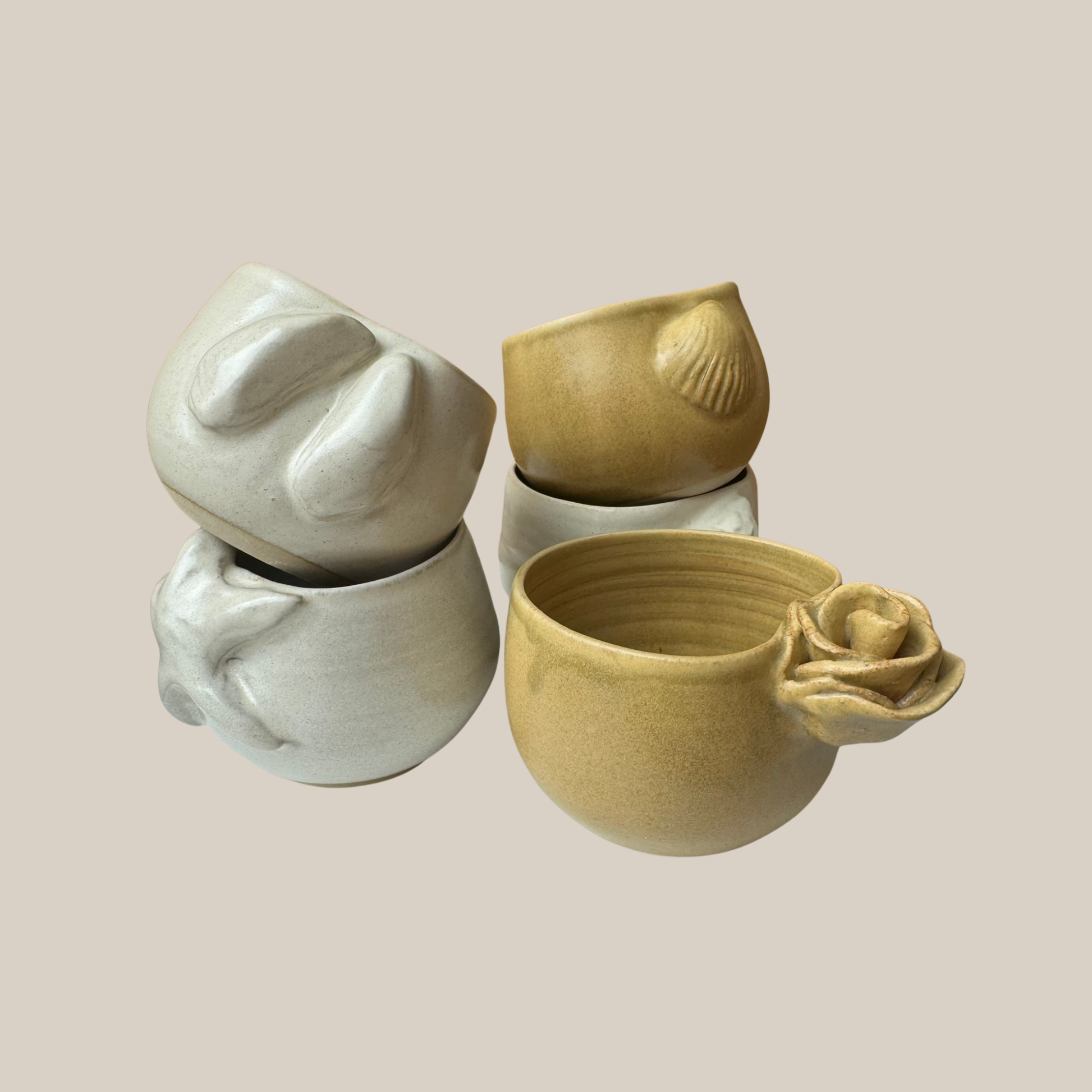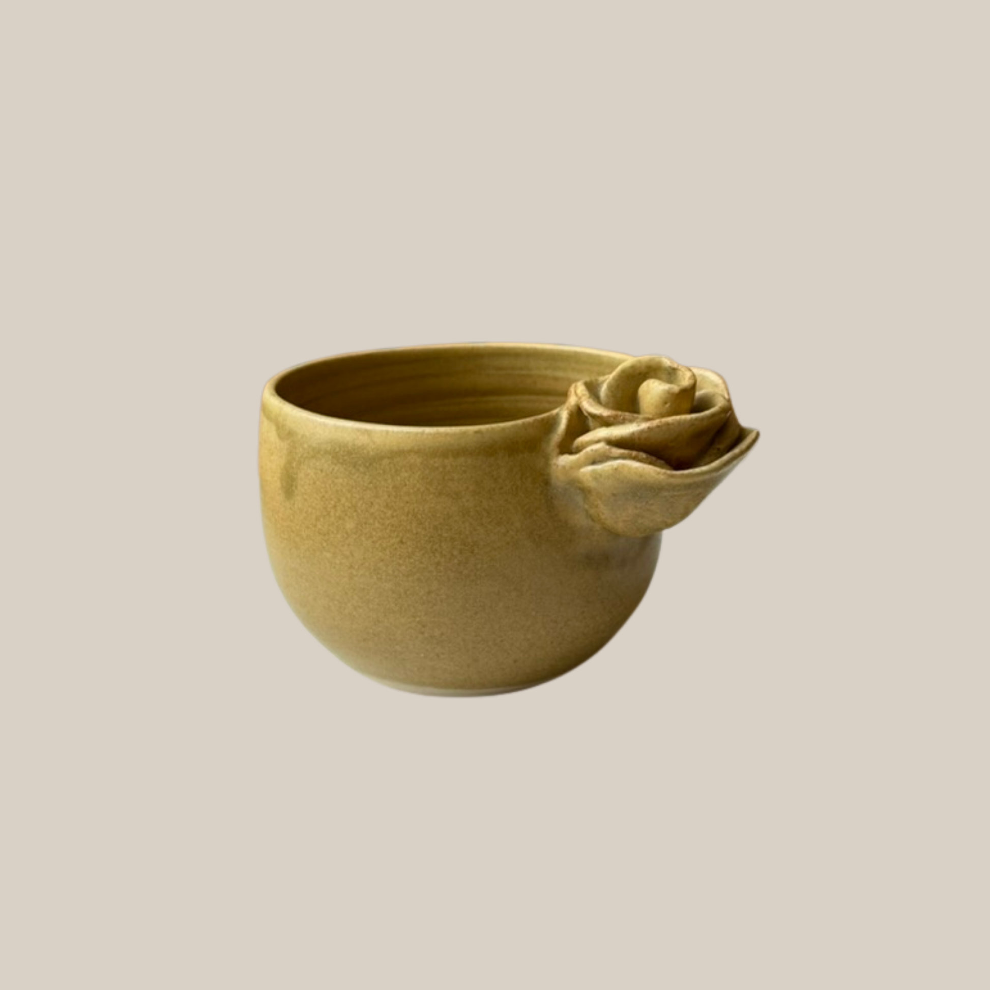 Keramik kop med rose i en størrelse passende til en lille kop kaffe. Drejet i lys stentøjs ler og glaseret i smuk gylden glasur.