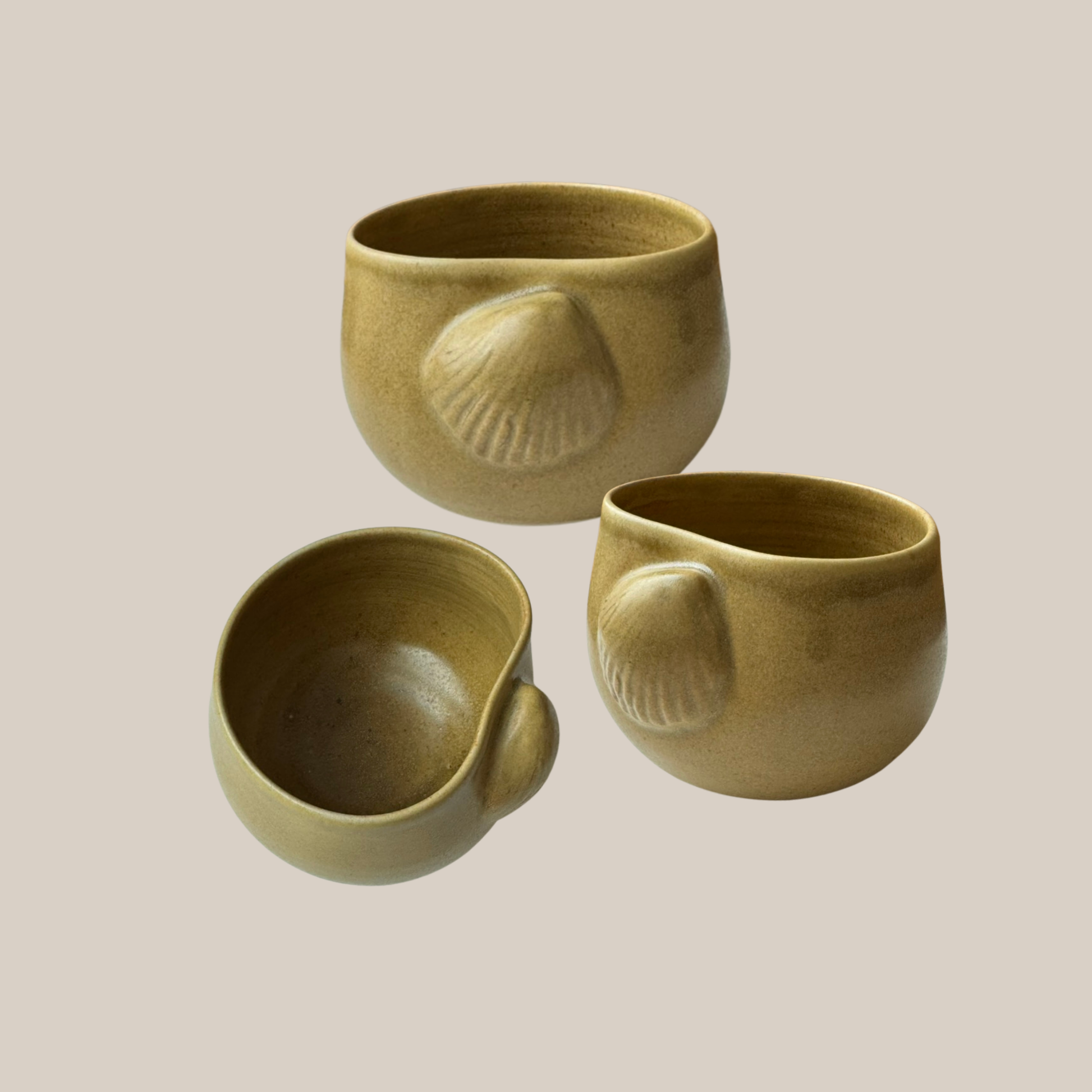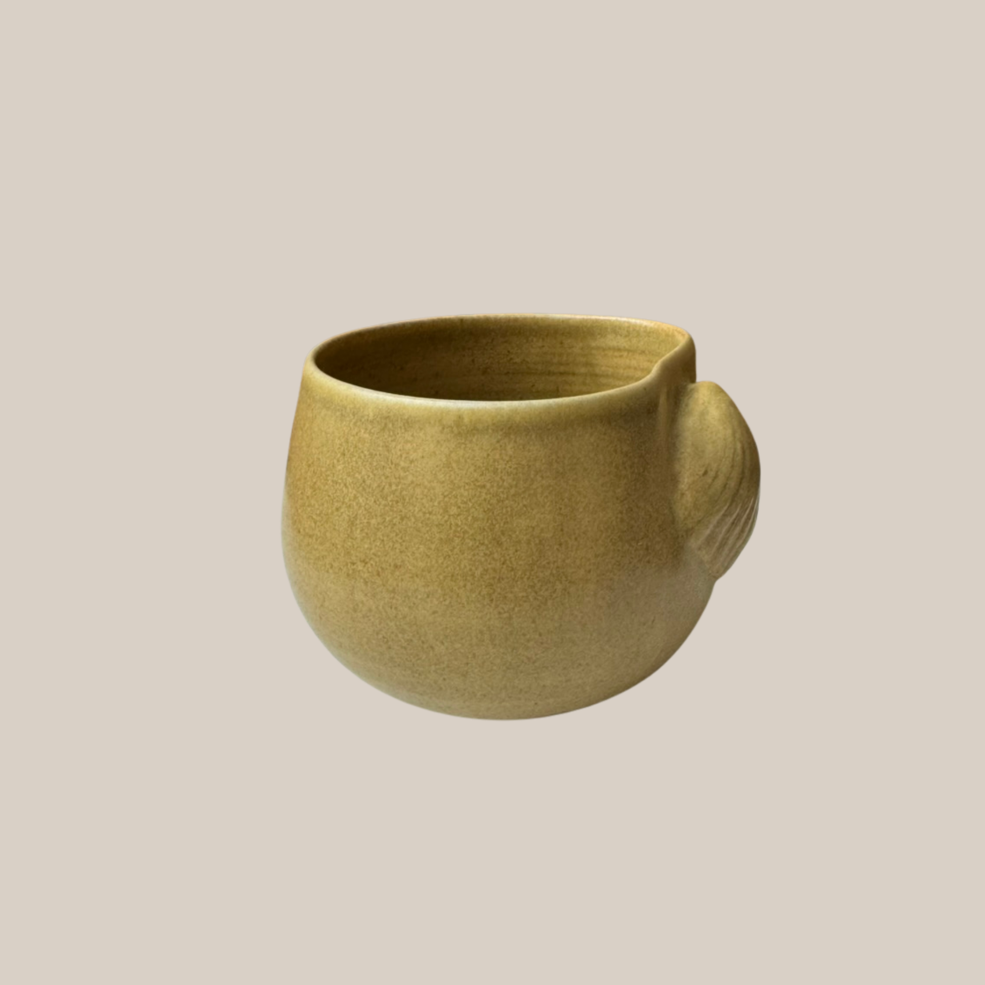 Lille keramik kop med en enkelt muslingeskal. Drejet i lys stentøjs ler og glaseret i smuk gylden glasur.