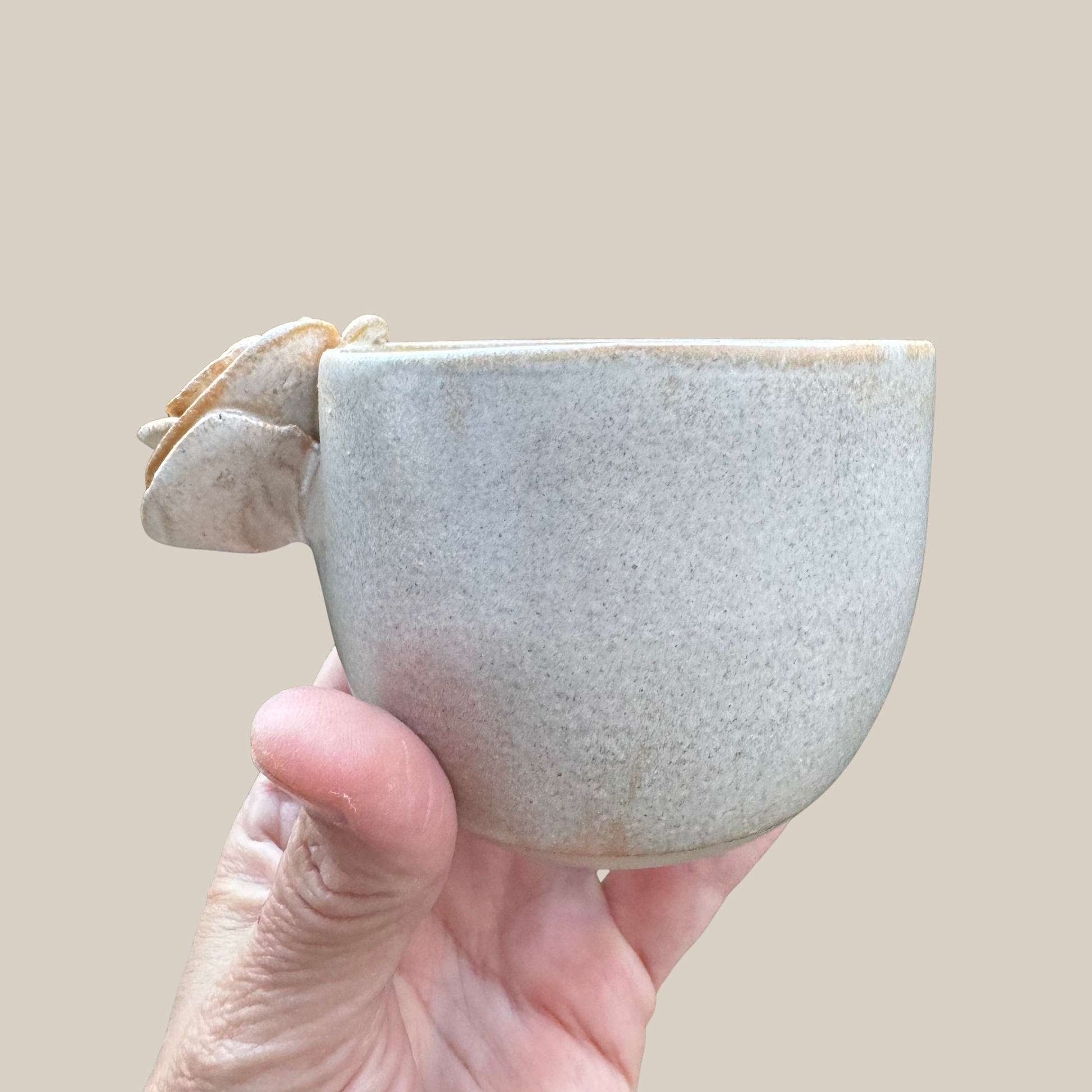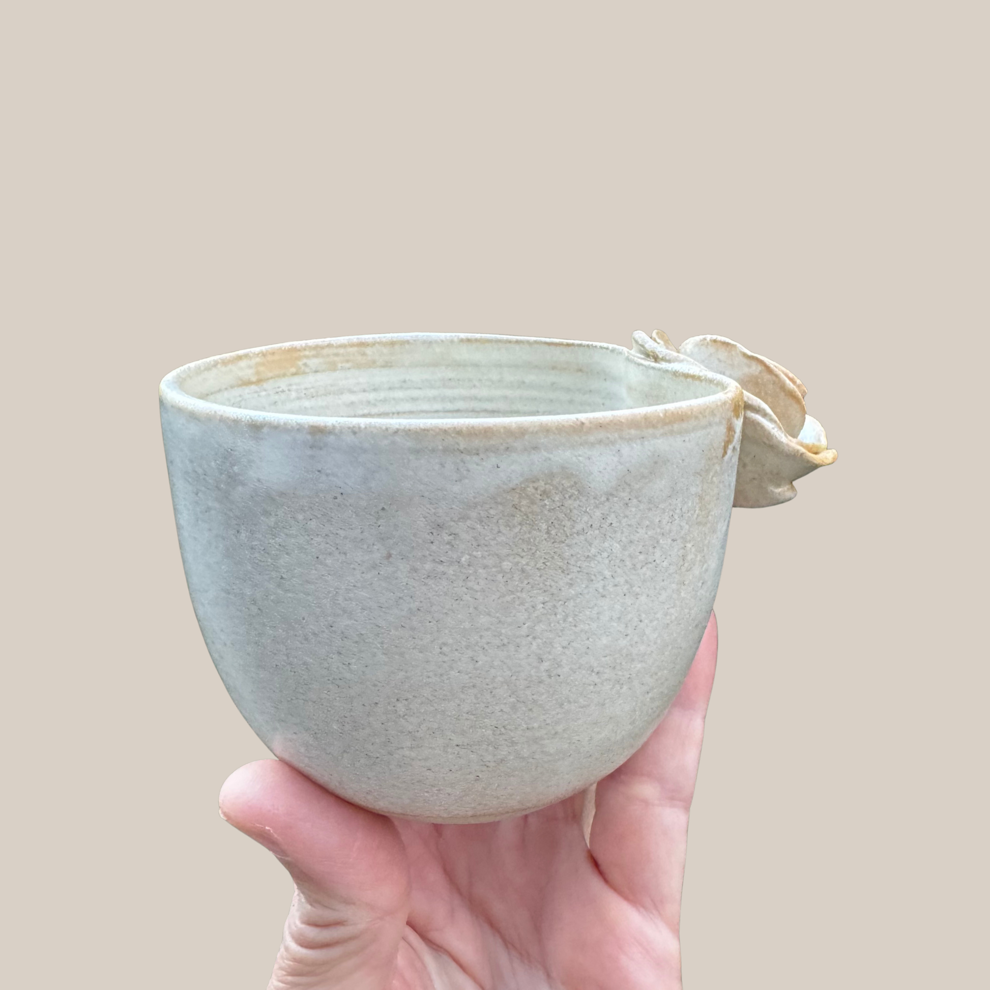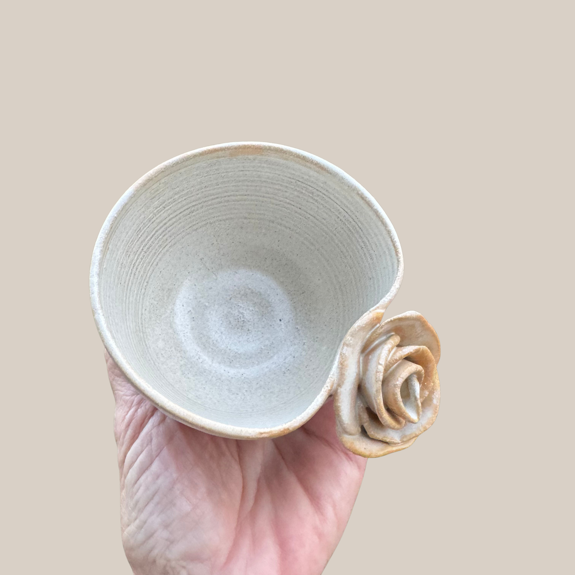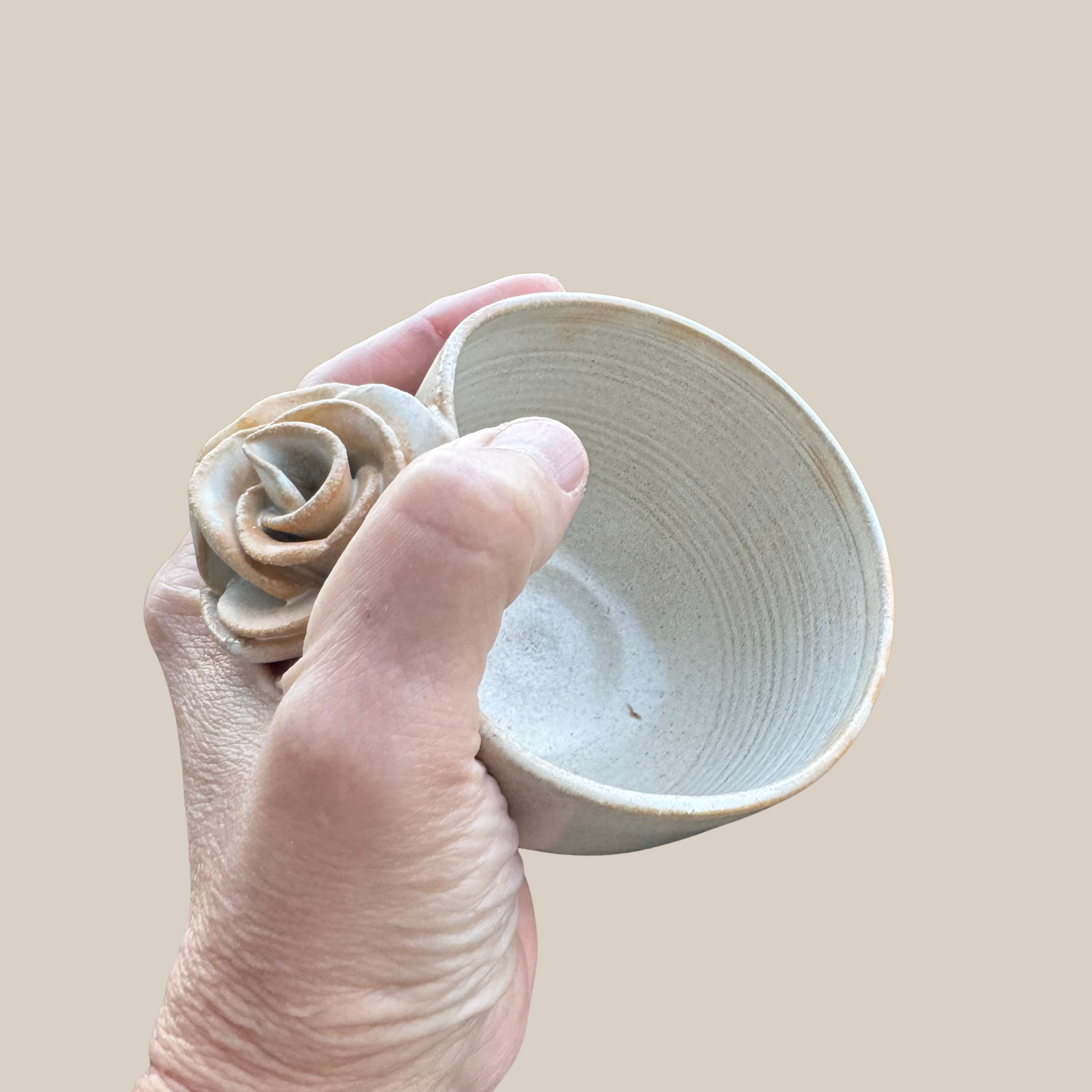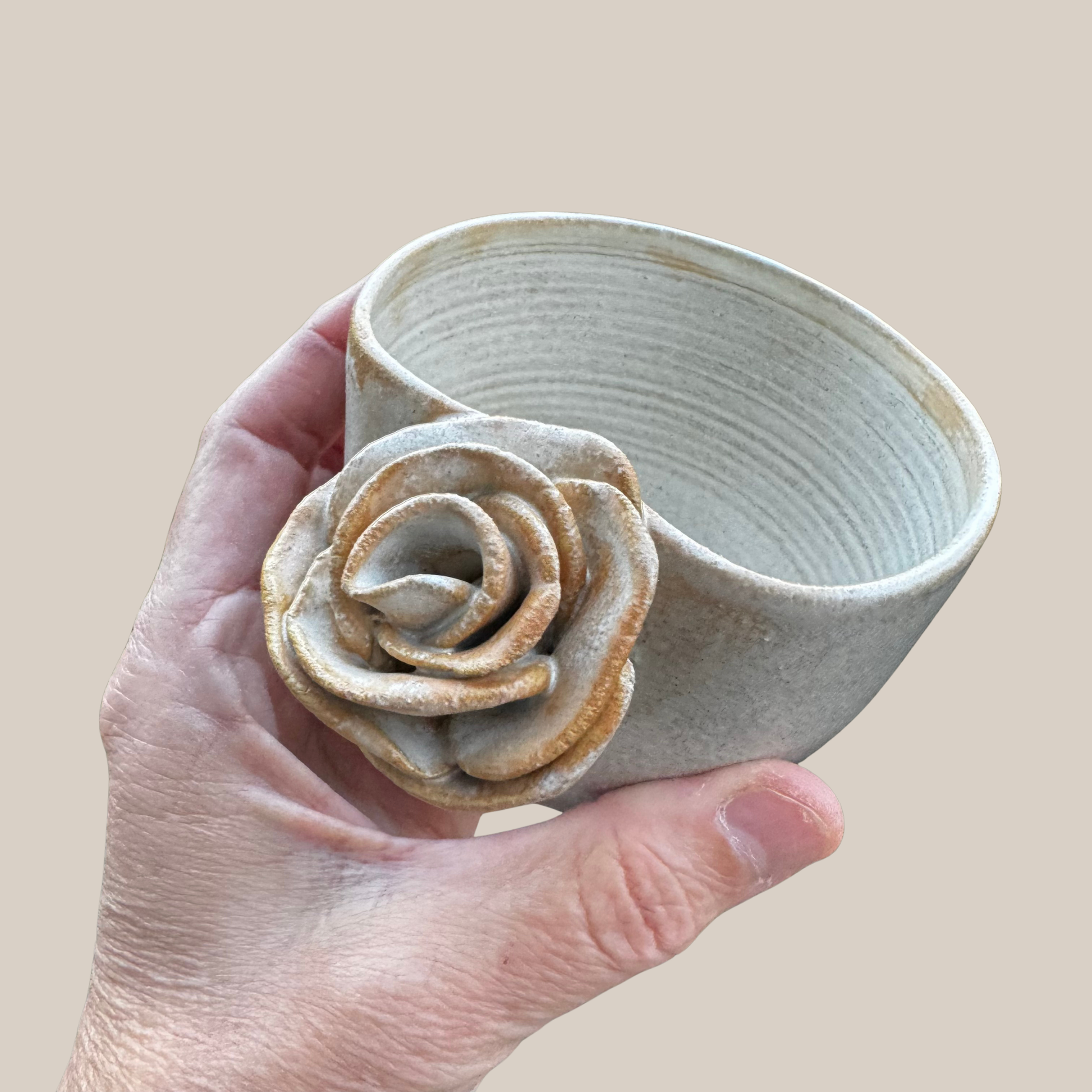 Keramik kop med rose i en størrelse passende til en lille kop kaffe. Drejet i lys stentøjs ler og glaseret i smuk beige glasur.