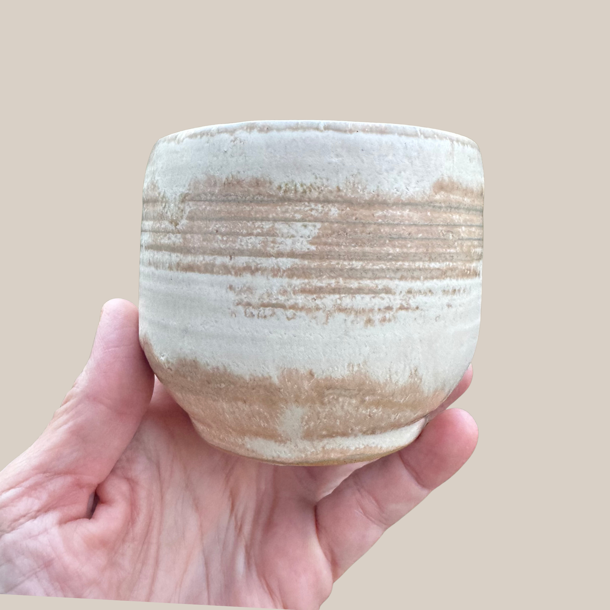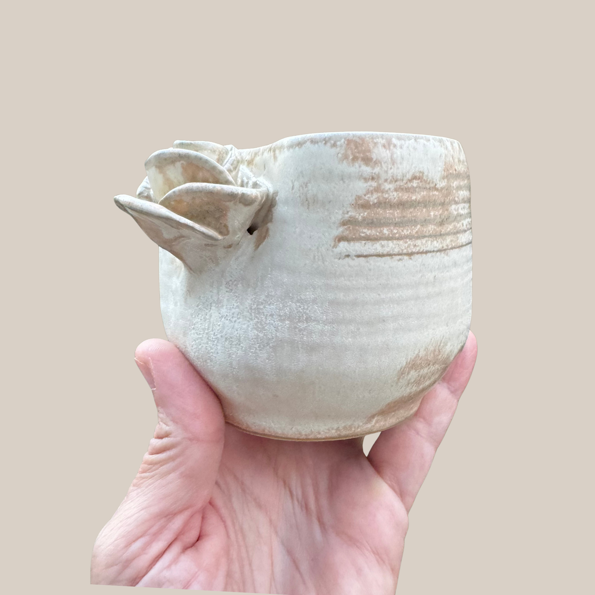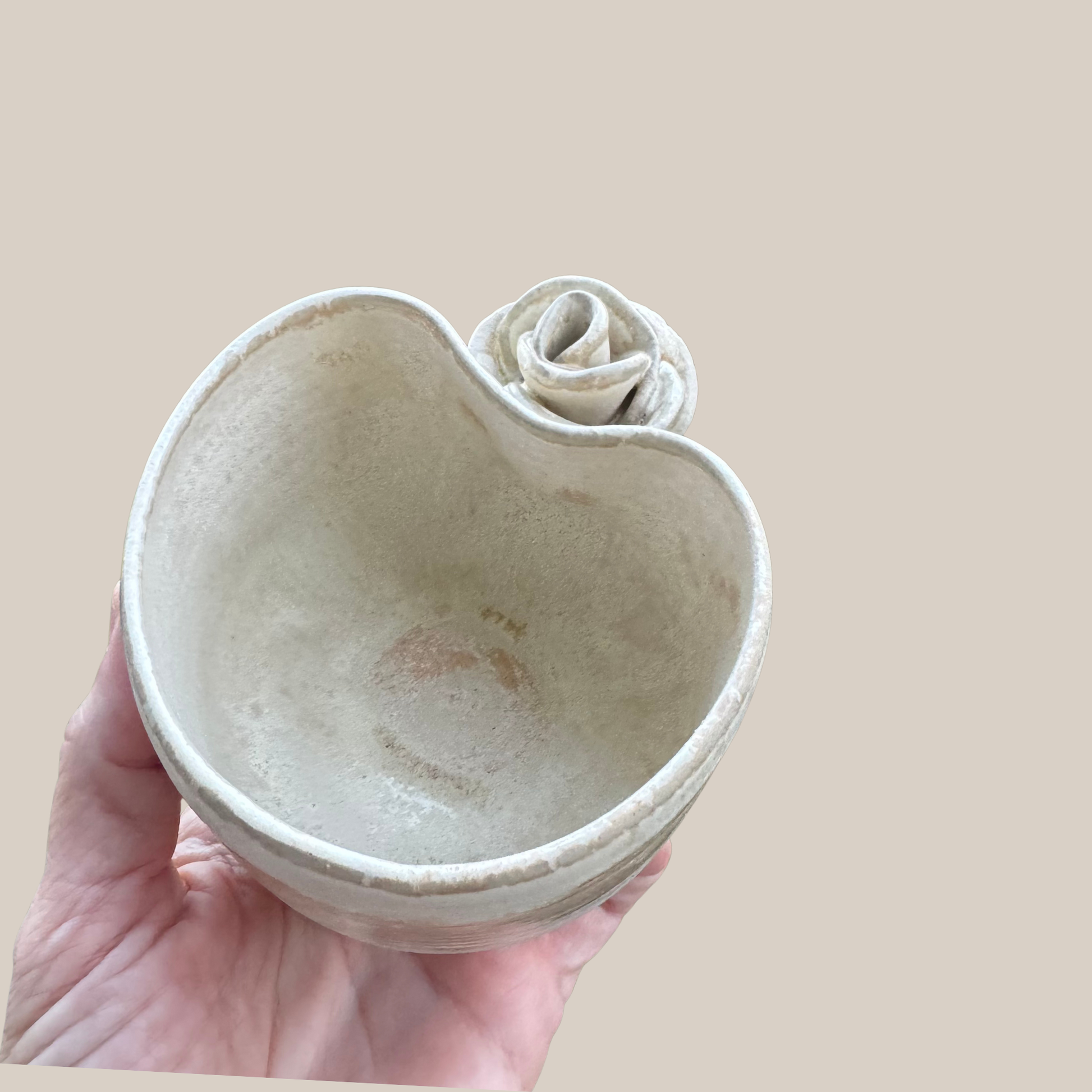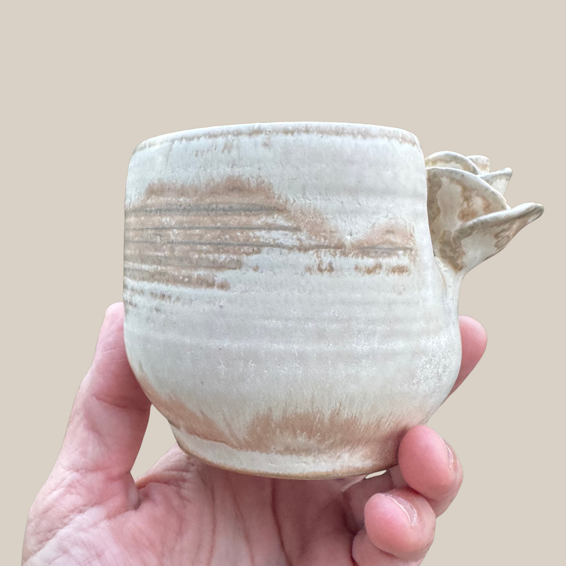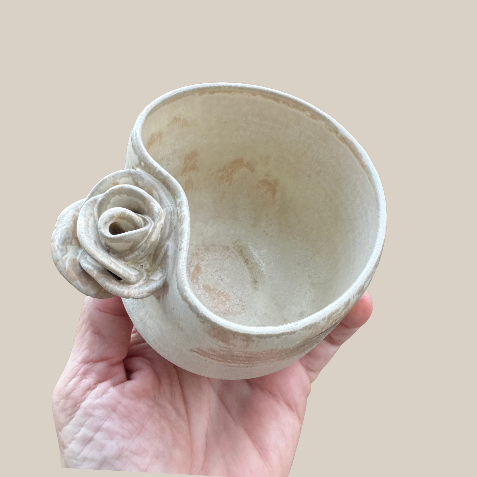 Keramik kop med rose i en størrelse passende til en alm. kop kaffe. Drejet i lys stentøjs ler og glaseret i smuk lys glasur med toner af brunt.
