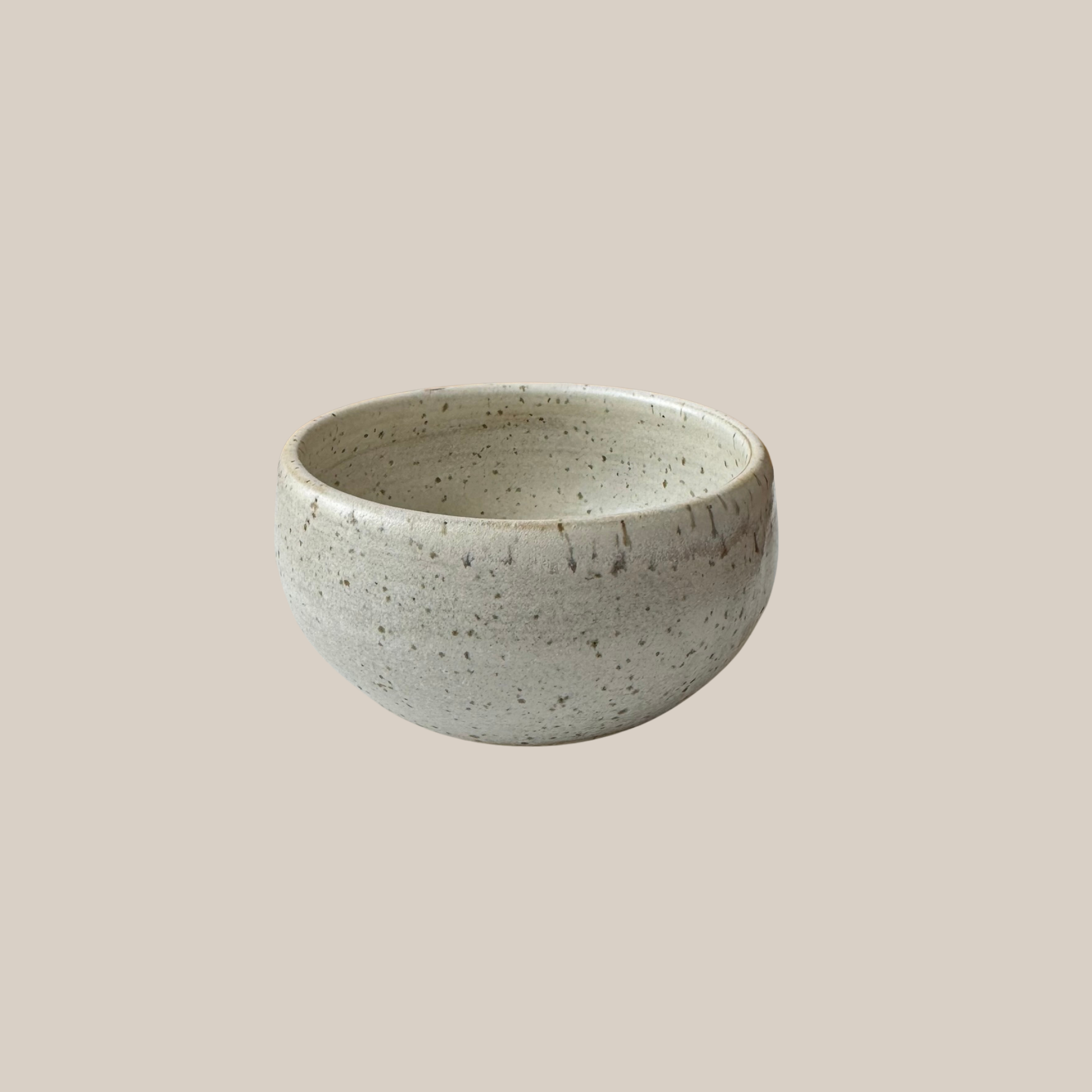 Lille saltkar i lyst stentøjsler med prikker og glaseret med beige glasur.