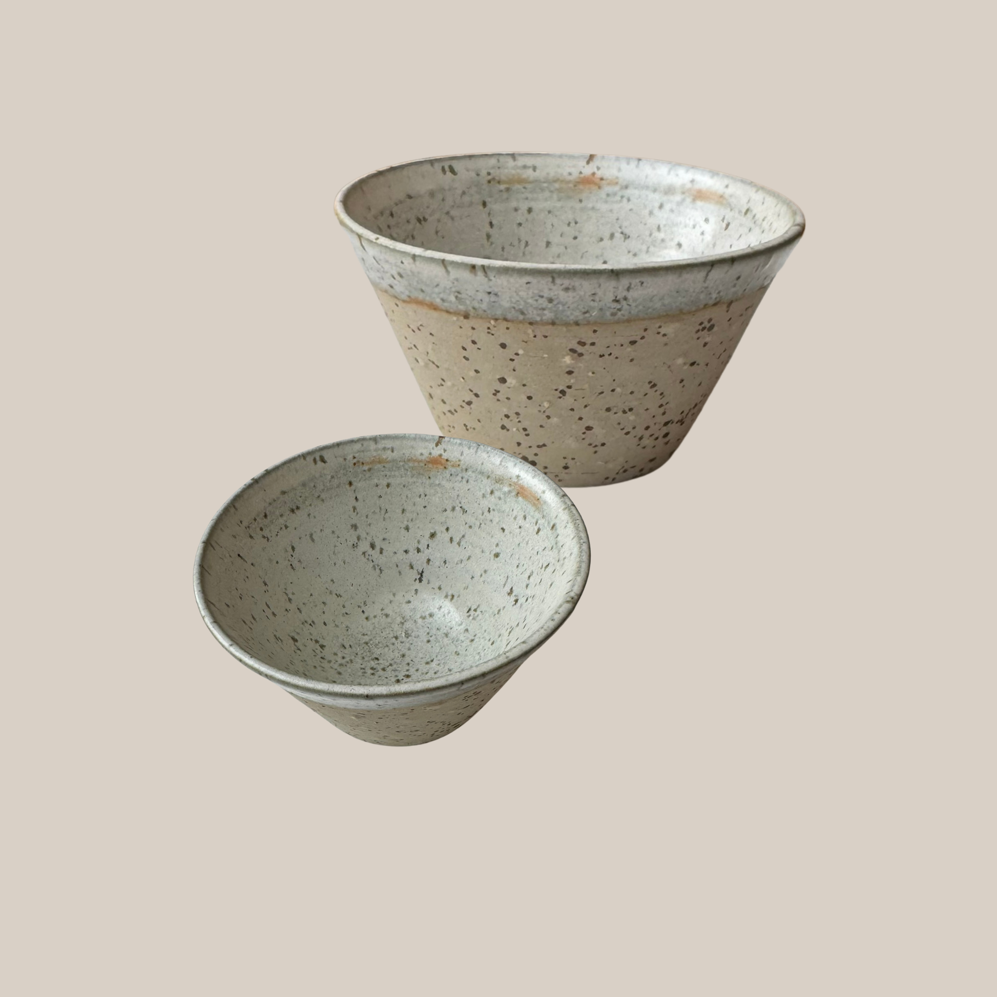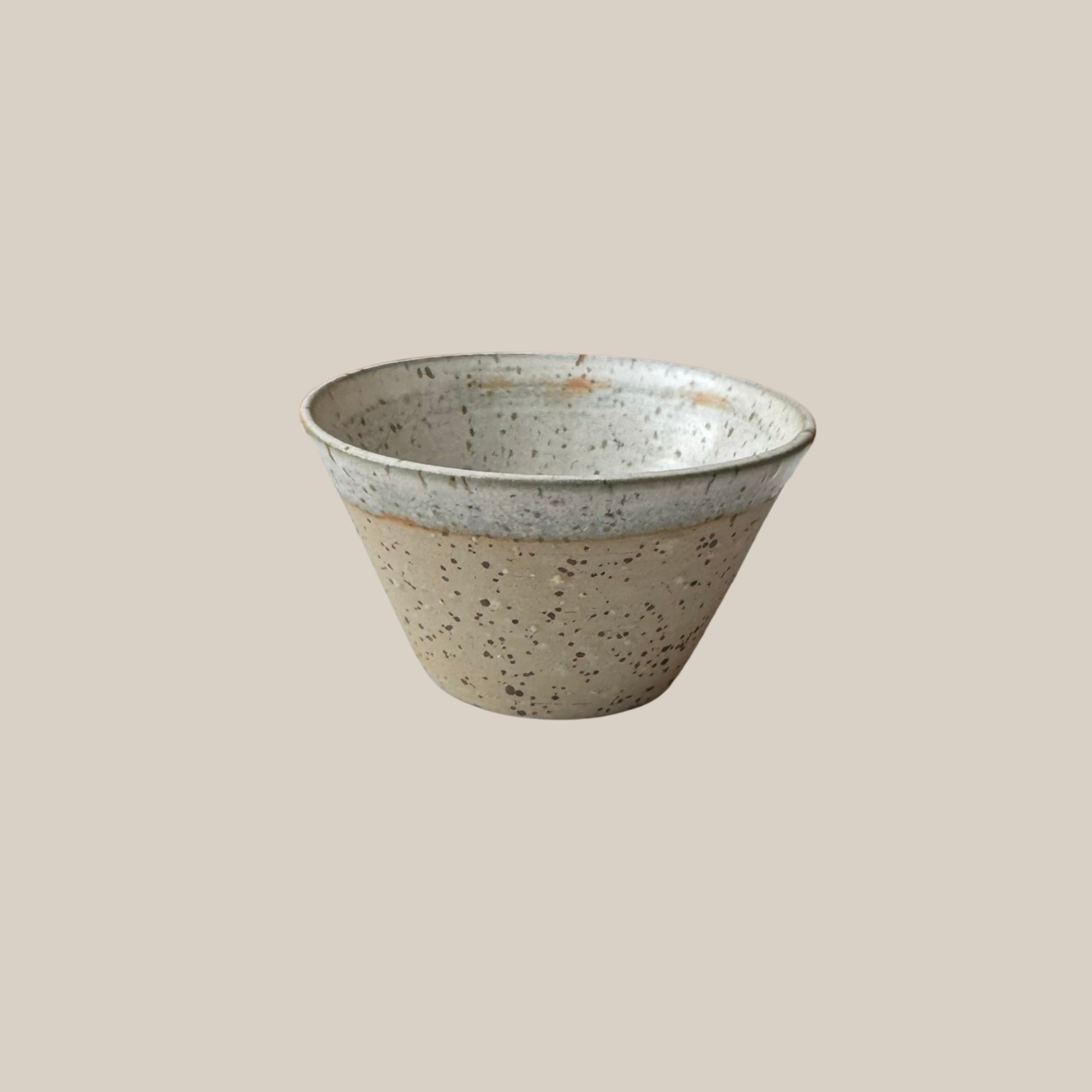 Lille saltkar i lyst stentøjsler med prikker og glaseret med beige glasur.